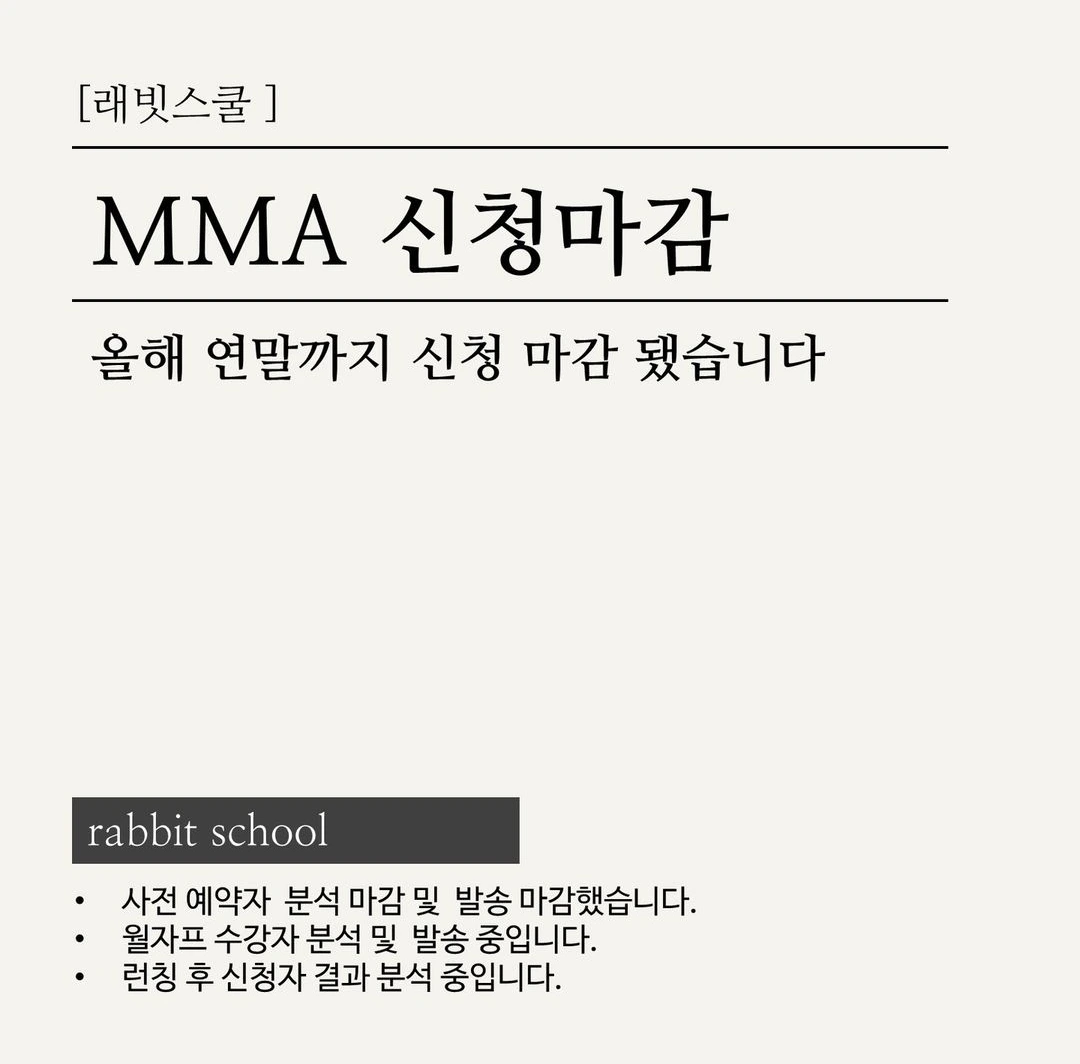 늘 래빗스쿨의 새로운 상품에 많은 성원 보내주셔서 감사합니다. 올해까지 MMA 신청은 모두 마감되었습니다.