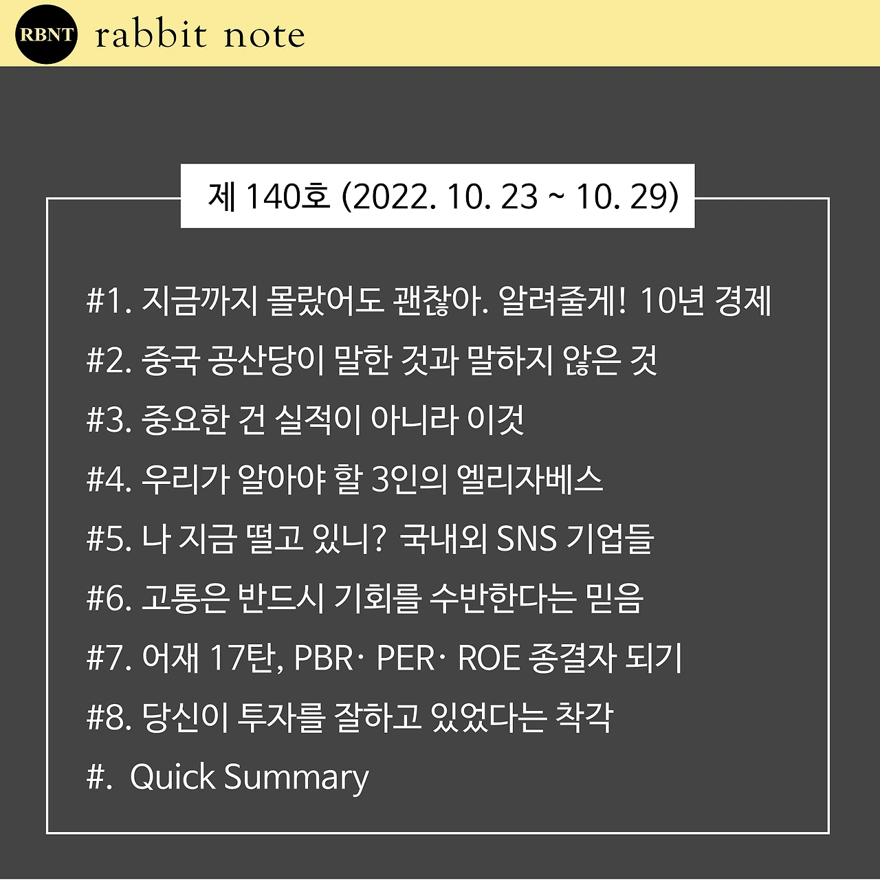 이번주는 영국 경제를 들었다 놨다 한 리즈 총리의 사임 발표부터 중국 공산당 당대회까지 굵직굵직한 글로벌 뉴스들이 많았습니다. 정치뉴스인듯 하지만 경제뉴스이기도 한 관련 뉴스들을 래빗노트 140호에서 쉽게 잘 풀어드릴게요! 그럼 140호에서 만나요~