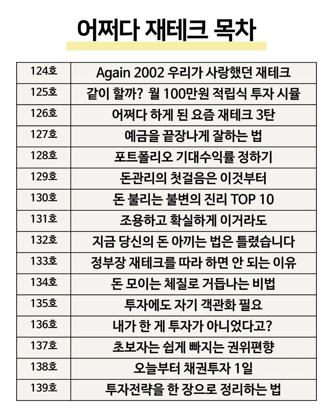 래빗노트 124호에서부터 <어쩌다 재테크>시리즈로 매주 여러분께 딱 필요한 알짜배기 재테크 정보를 알려드리고 있는데 많은 분들이 좋아해주셔서 저희도 뿌듯하네요.