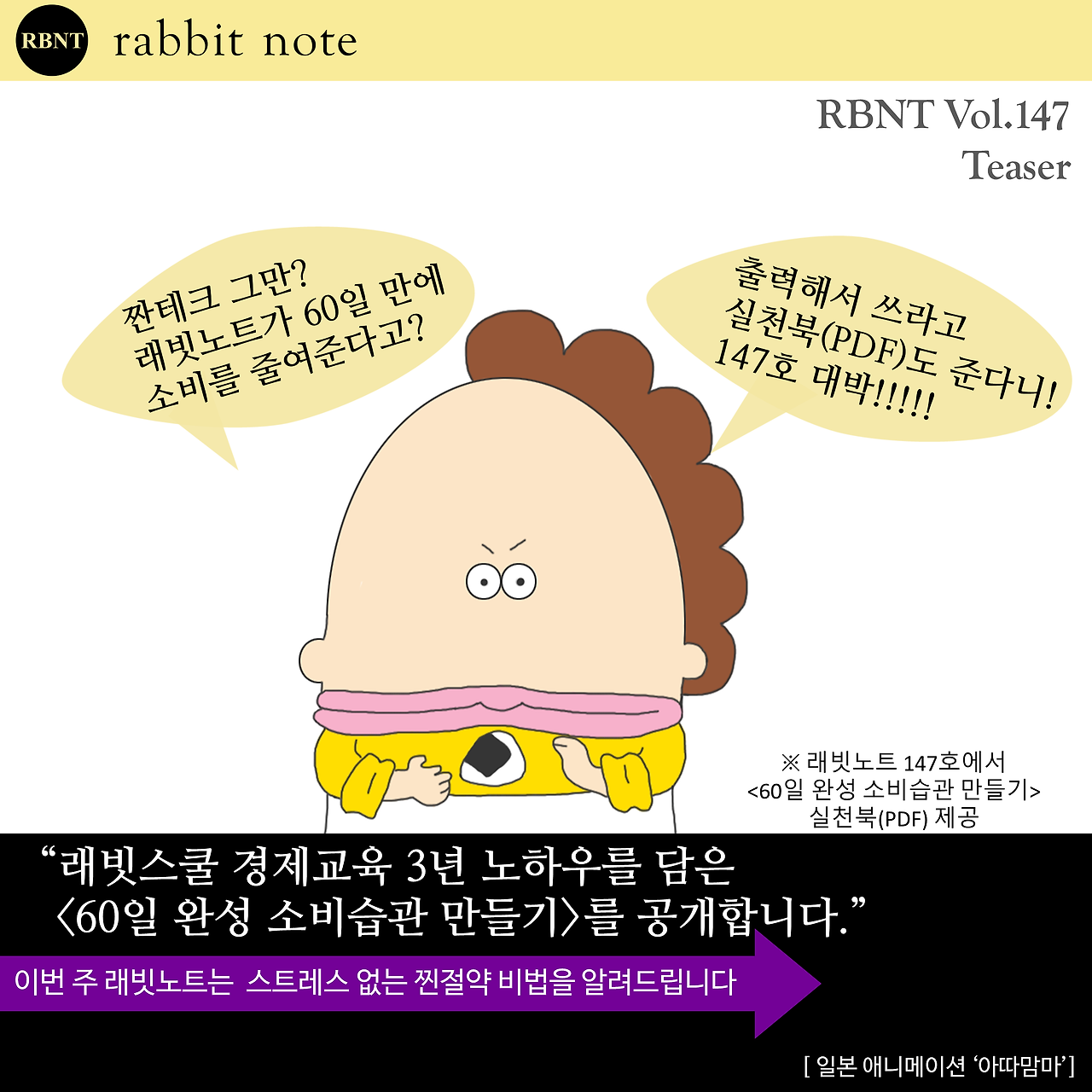 여러분의 마음을 다~ 읽고 있지요. 이번 147호에서는 60일 동안 따라하실 수 있도록 5단계로 찐절약법을 알려드립니다. 스트레스 받는 짠테크 그만 하셔도 됩니다. 60일 뒤에는 분명 지출이 줄어있을 테니까요. 나만의 소비습관 만들기 실천북(PDF) 링크도 보내드리니 다음 주부터 바로 시작해보세요. 아! <60일 완성 소비습관 만들기>는 래빗스쿨의 디어래빗과 월자프와 같은 세계관임을 참고하세요~