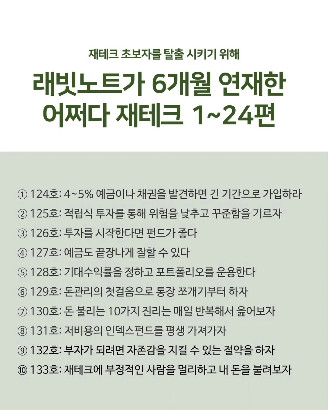 오늘 강추위에 다들 고생 많으셨습니다~ 래빗노트 안에 스몰 연재를 꾸준히 진행했었죠. 어쩌다 재테크 시리즈는 6개월의 대장정을 끝내며 이번 주 148호에 총정리편을 준비하고 있습니다. 지금까지 어재를 읽지 못하셨더라도 총정리편에서 핵심만 챙기셔도 좋을 것 같네요.