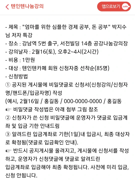 오늘 오전에 다음 No.1 재테크 카페인 텐인텐에서 제 강연 신청을 받고 있습니다.