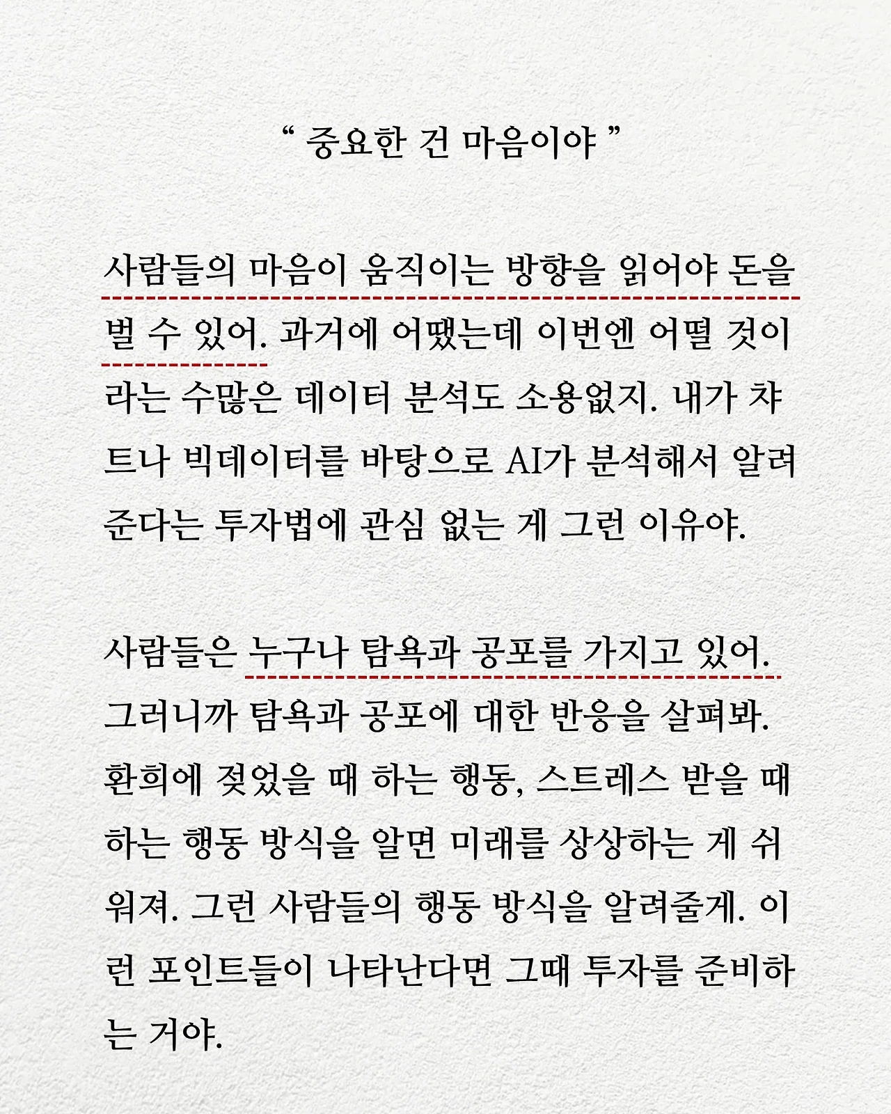 ■한 페이지만 먼저 긁어왔습니다. AI가 모든 걸 다 해줄 것 같은 시대에 중요한 건 사람의 마음이라 하십니다. 이제 복잡한 챠트 분석 안 해도 되는 건가요? 챠트보다 더 읽기 어려운 게 사람 마음은 아니겠죠? 포인트도 다 풀어주신다고 하니까 새겨 들어보겠습니다.