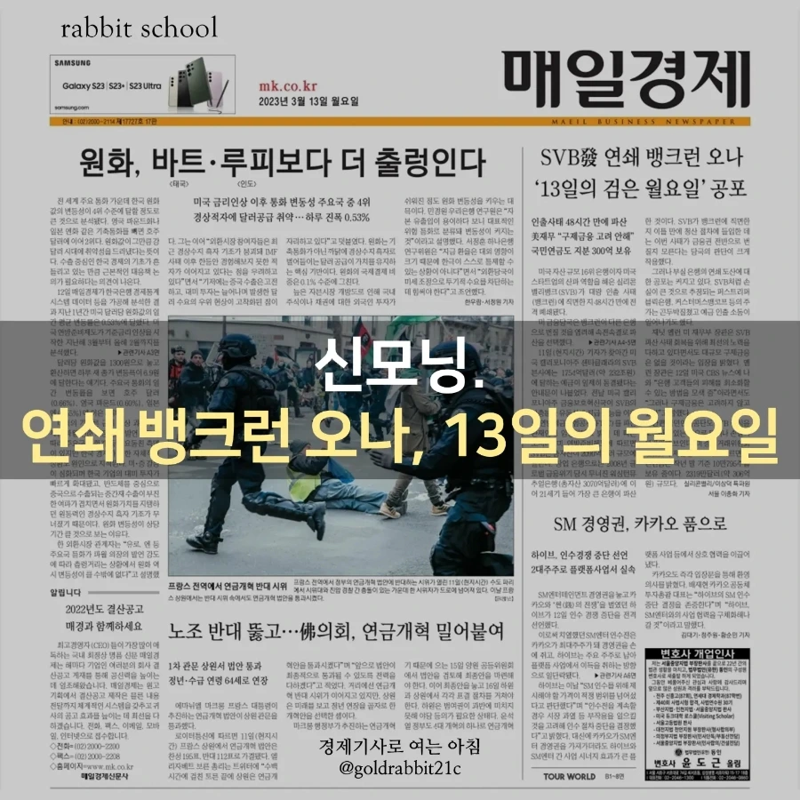 3. 이게 다 파월 때문이야! SVB 사태로 월급 못 받고, 예금 초과 입금으로 원금 보장 못 받는 사람들이 아우성이다. 파월 의장은 지난 7일 의회에서 매파 발언을 쏟아내면서 빅스텝( 0.5%P 인상)을 시사했지만 SVB 파산 이후 은행업계 안정이 중요해질 경우 빅스텝을 밀고 나가기 어려울 것이다. 그러나 각종 지표는 미국 경제가 여전히 양호하다는 점을 시사하고 있어 연준의 긴축에 힘이 실릴 것이란 반론도 있다. 이번 SVB 사태는 기술· 바이오 기업에 국한된 문제기 때문에 다른 금융권에 미칠 여파는 적다고 하는데. 글쎄다. 사람들 뱅크런을 막기 위해 덮으려고 하는 것일 수도 있고. 그나저나 은행 파산할 거 알고 그레그 베커 CEO나 이달 말에 지급하려던 보너스 앞당겨 줘버리고, 자식이 보유하고 있던 주식을 매각했다고 한다. 각 은행마다 예금자 보호법 이상으로 넣어둔 돈 있으면 좀 분산해둘 필요가 있겠다.