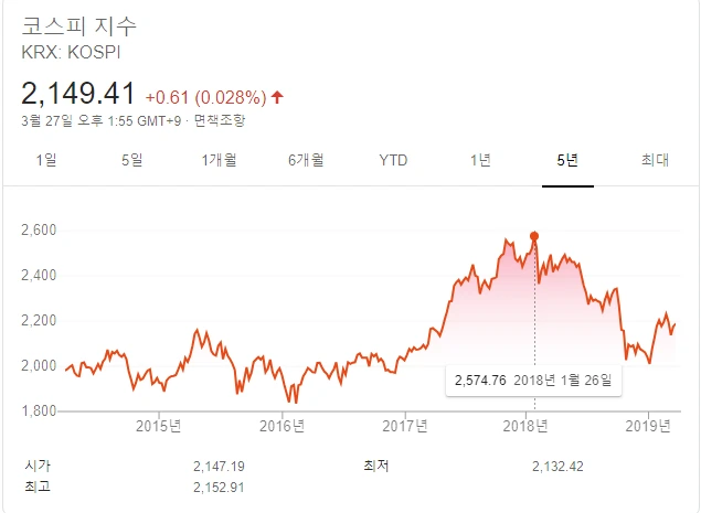 이명박 대통령 선거 때부터 자신 임기 중에 2500을 넘길 거라 했는데, 의외로 이번 정부에서 코스피는 1월 29일 2,598.19(종가 기준)까지 치솟으며 5년간의 박스권 장세에 종지부를 찍었다. 여러 가지 이유가 있었겠지만 사상 초유의 대통령 탄핵에서 문재인 대통령 당선까지 어지럽던 국내 정세가 안정이 되었고, 미국의 경제 호황으로 우리나라 수출 성적이 좋았기 때문이다. 또한 김정은 발 평화 모드로 북핵 리스크에서 벗어나나 하는 기대감으로 외인 자본이 많이 들어왔다.