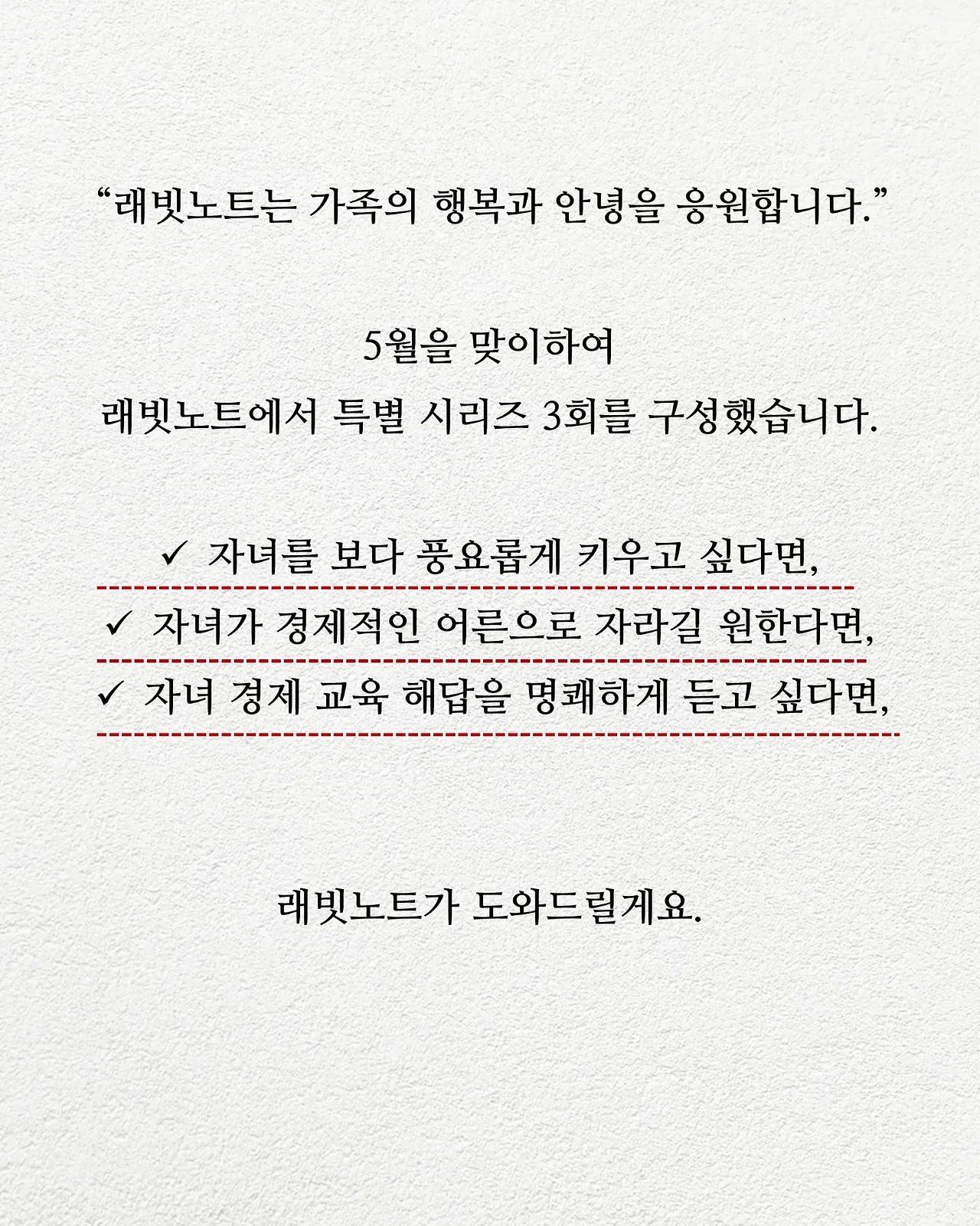 래빗님들의 보다 나은 경제생활을 위해 래빗노트가 특별 연재를 준비했습니다. 총 3회(167~169호) 가정의 달 특별 연재도 놓치지 마세요~