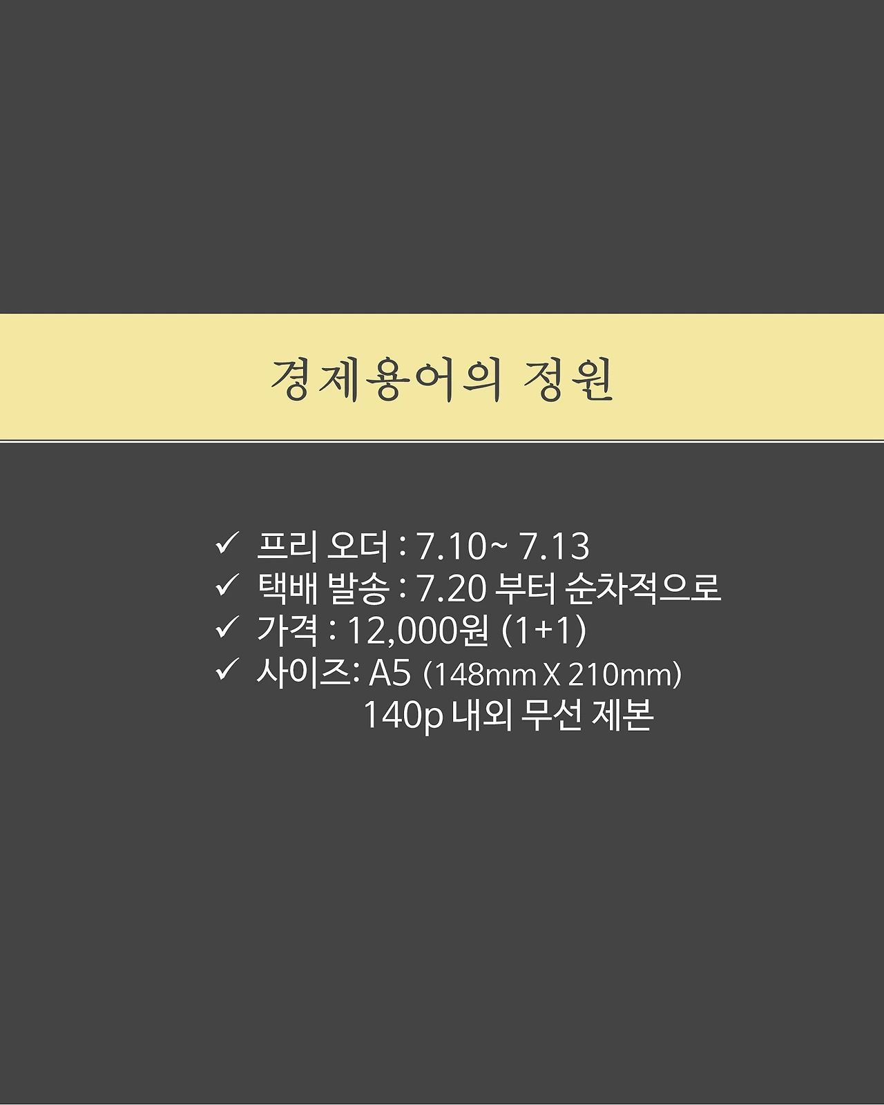 여러분들의 뜨거운 성원에 힘입어 2차 제작에 들어갑니다. 지난번 날짜를 늦게 확인하시어 구매 못 하셨던 분들, 하반기 들어 경제 공부를 시작하고 싶은 분들 모두 환영합니다!!