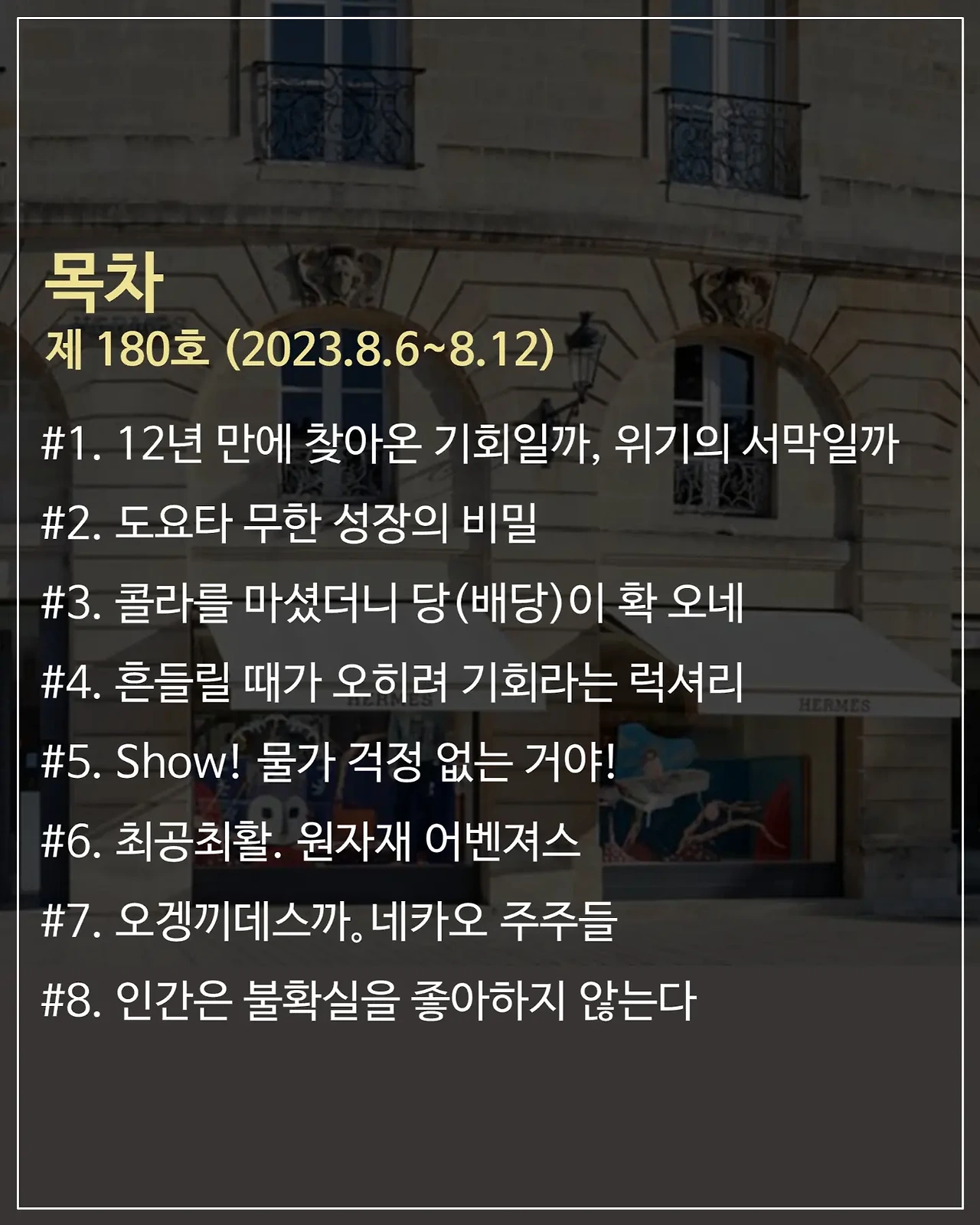 4. 명품 산업이 지금 재미있게 돌아가고 있습니다. 5월에 한 번 짚어드렸던 명품 산업을 2개월이 지난 지금 다시 분석해 드리려고 합니다. 흔들리는 명품 속에서 왜 난 에르메스만 보이는 거야~