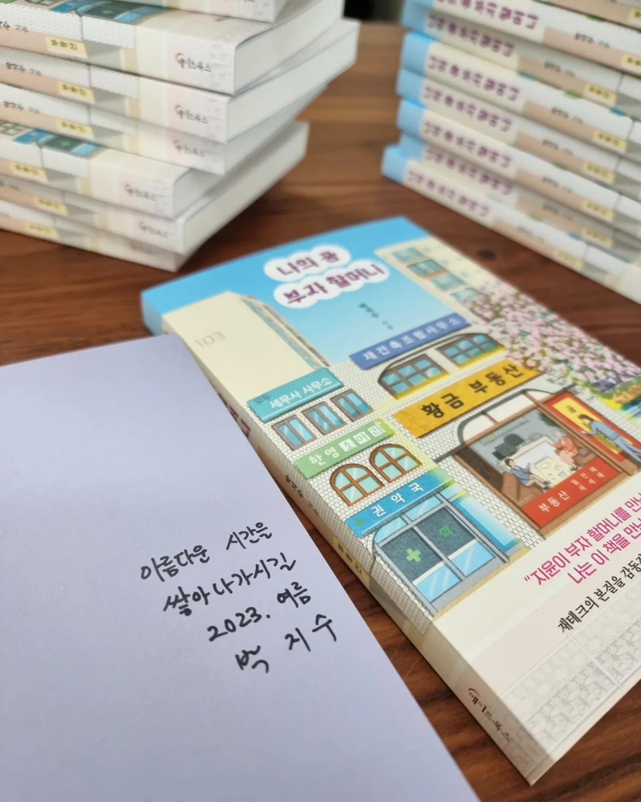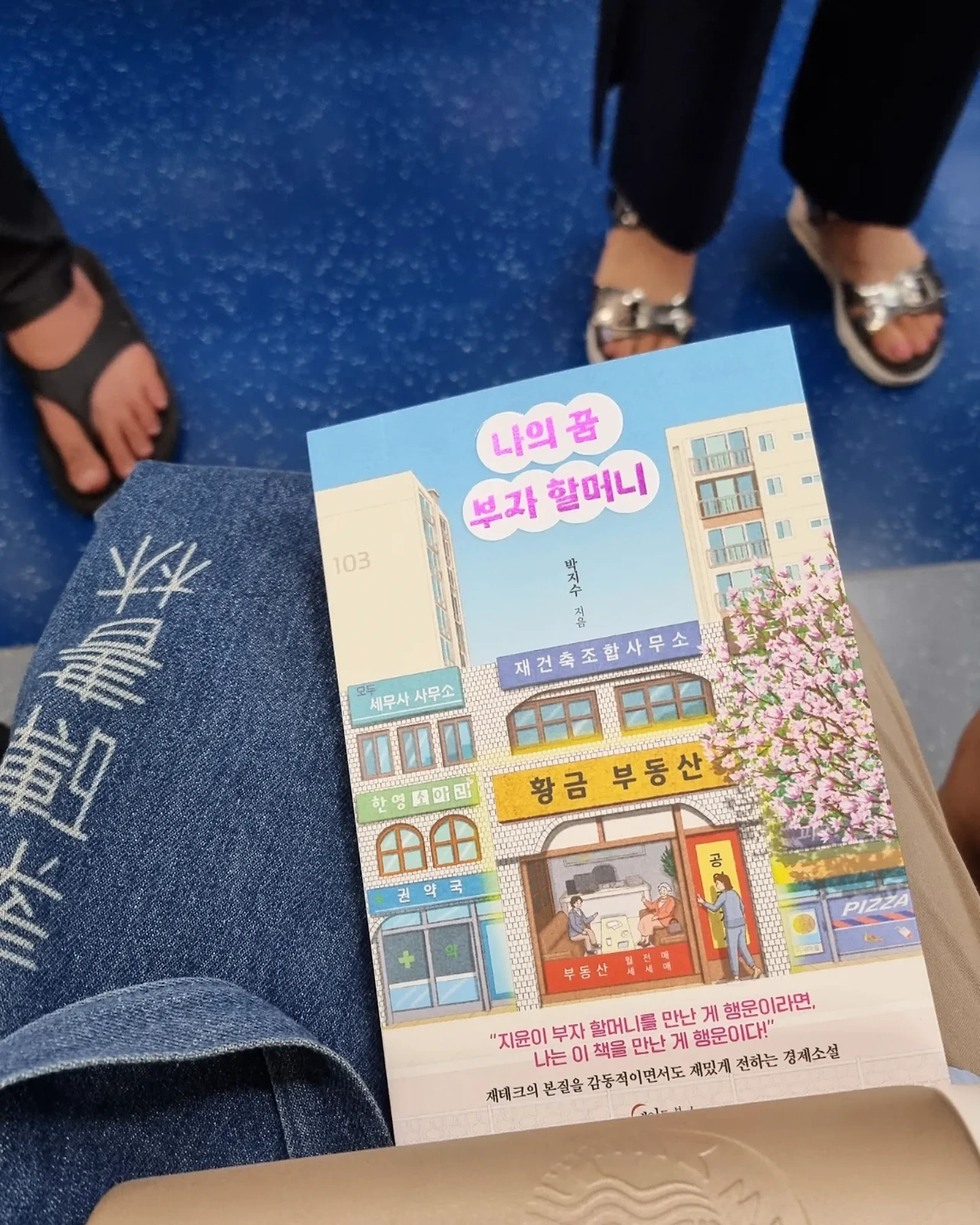 참! 책 사이즈가 기존 제 책들보다 작아요. 소설책은 폭이 좀 좁고 가볍게 만드나 봅니다. 쟈철에서 한 손에 들고 읽어도 무겁지 않았어요. 저는 오늘밤 독자님의 마음으로 <나의 꿈 부자 할머니>를 읽으렵니다. 내일 밤에는 함께 읽어주실 거죠♡♡♡