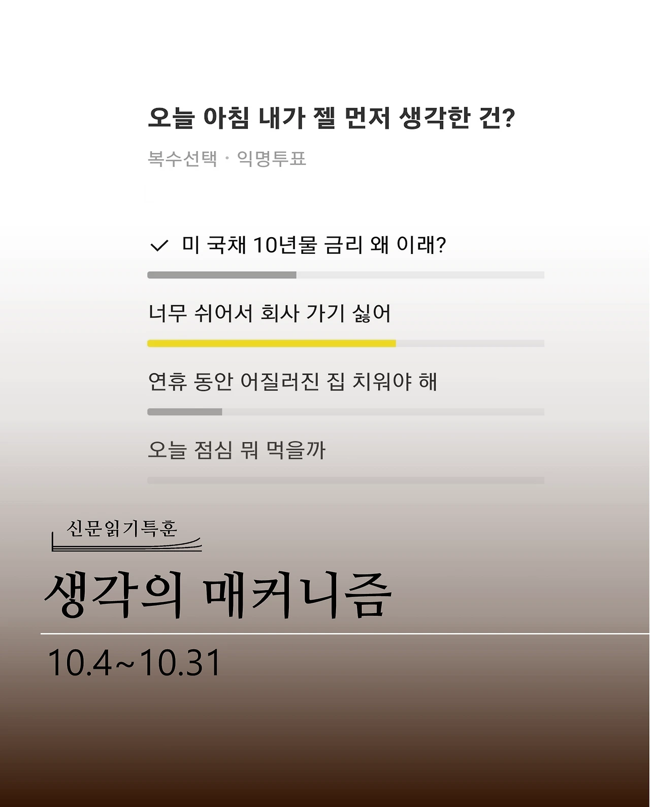 신문읽기특훈 10월반 추가 인원 3명까지 받을 수 있어요. 11월에는 신문읽기특훈 안식월이라 대기 신청을 안 받습니다. 다음 달에 해야지 미루셨던 분들이라면 오늘(10/4) 마감이니까 특훈으로 들어오세요~