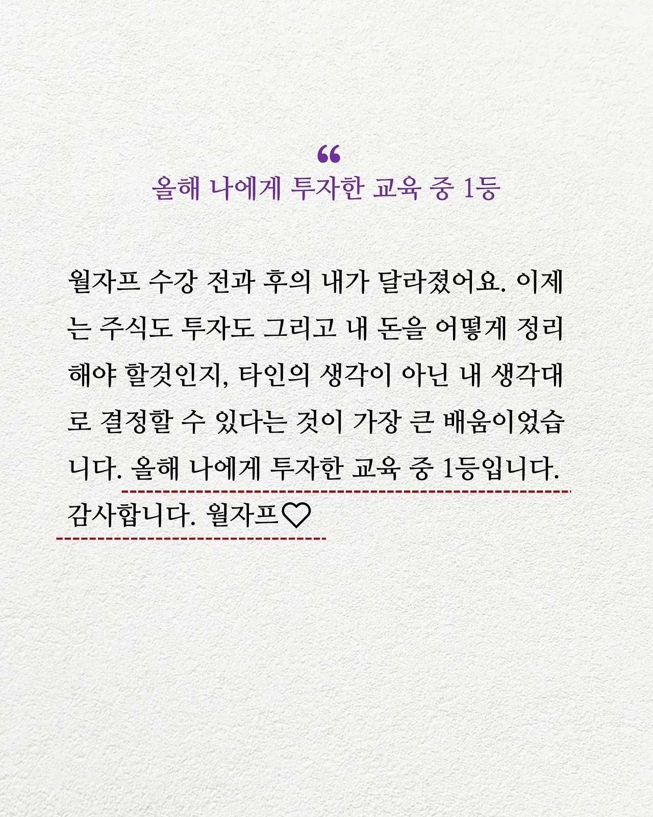 월자프 수강 전과 후의 내가 달라졌어요. 이제는 주식도 투자도 그리고 내 돈을 어떻게 정리해야 할것인지, 타인의 생각이 아닌 내 생각대로 결정할 수 있다는 것이 가장 큰 배움이었습니다. 올해 나에게 투자한 교육 중 1등입니다. 감사합니다 월자프♡