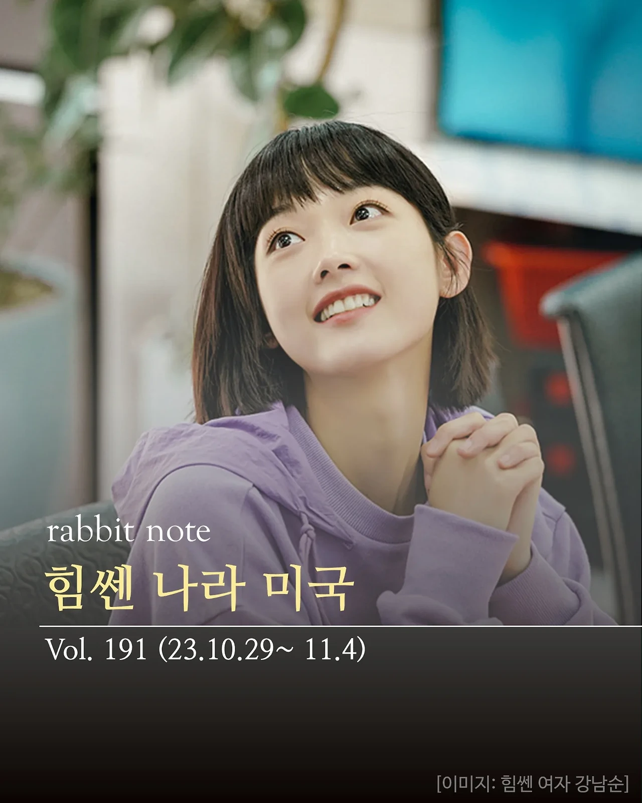 1. 요즘 핫한 드라마죠. '힘쎈 여자 강남순'. 190호 래빗노트 QS에서도 강남순 에피소트를 다뤘었죠. 갠 적으로 강남순과 도봉순, 범죄도시 마형사가 함께 어벤져스를 만들어 보면 어떨까 하는 생각을 해봤습니다. 지금 3분기 GDP발표나고 강한 나라 한 번 더 입증한 곳이 미국이죠. 트럼프 대통령도 한 번 더 강해질 준비를 하고 있는데요. 본편에서 재미있게 알려드릴게요.