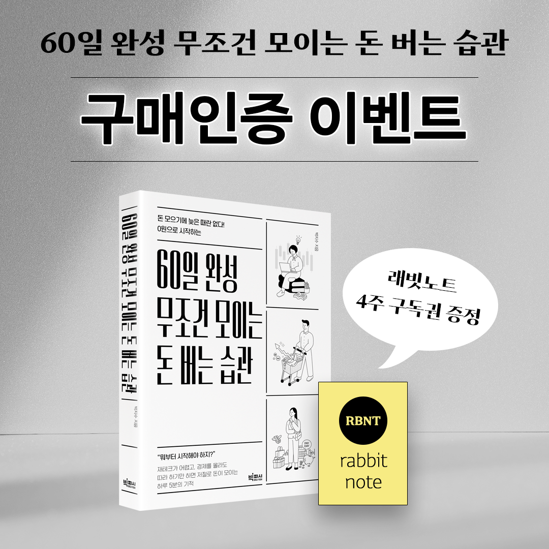< 60일 완성 무조건 모이는 돈 버는 습관>과 습관노트만으로도 습관 만들기가 가능하지만, 래빗스쿨에서 좀 더 밀착 관리해 드리는 프로그램을 만들고 있어요. 새로 조교쌤도 한 분 영입해서 준비하고 있으니 정리되면 다시 알려 드릴게요.