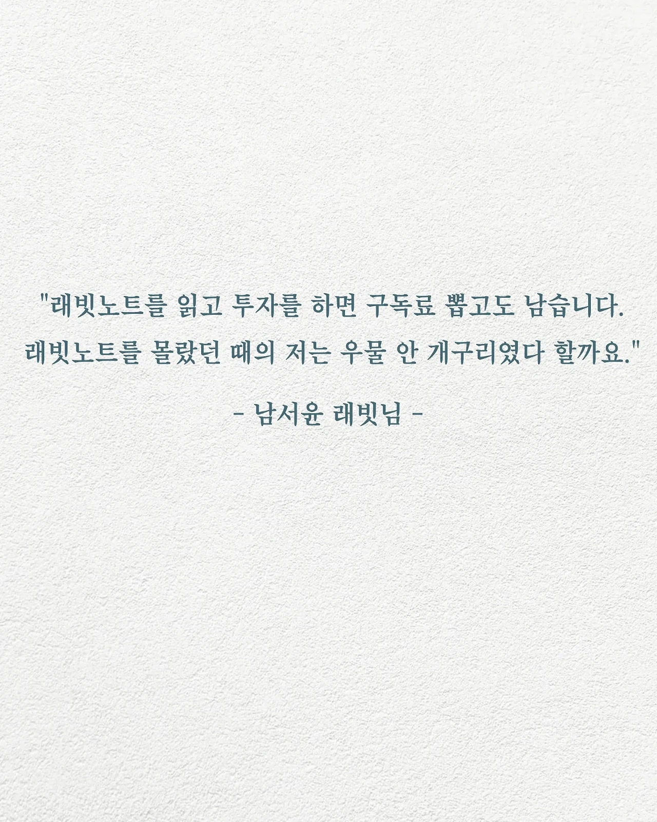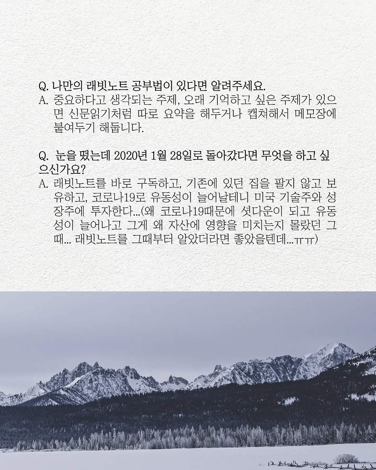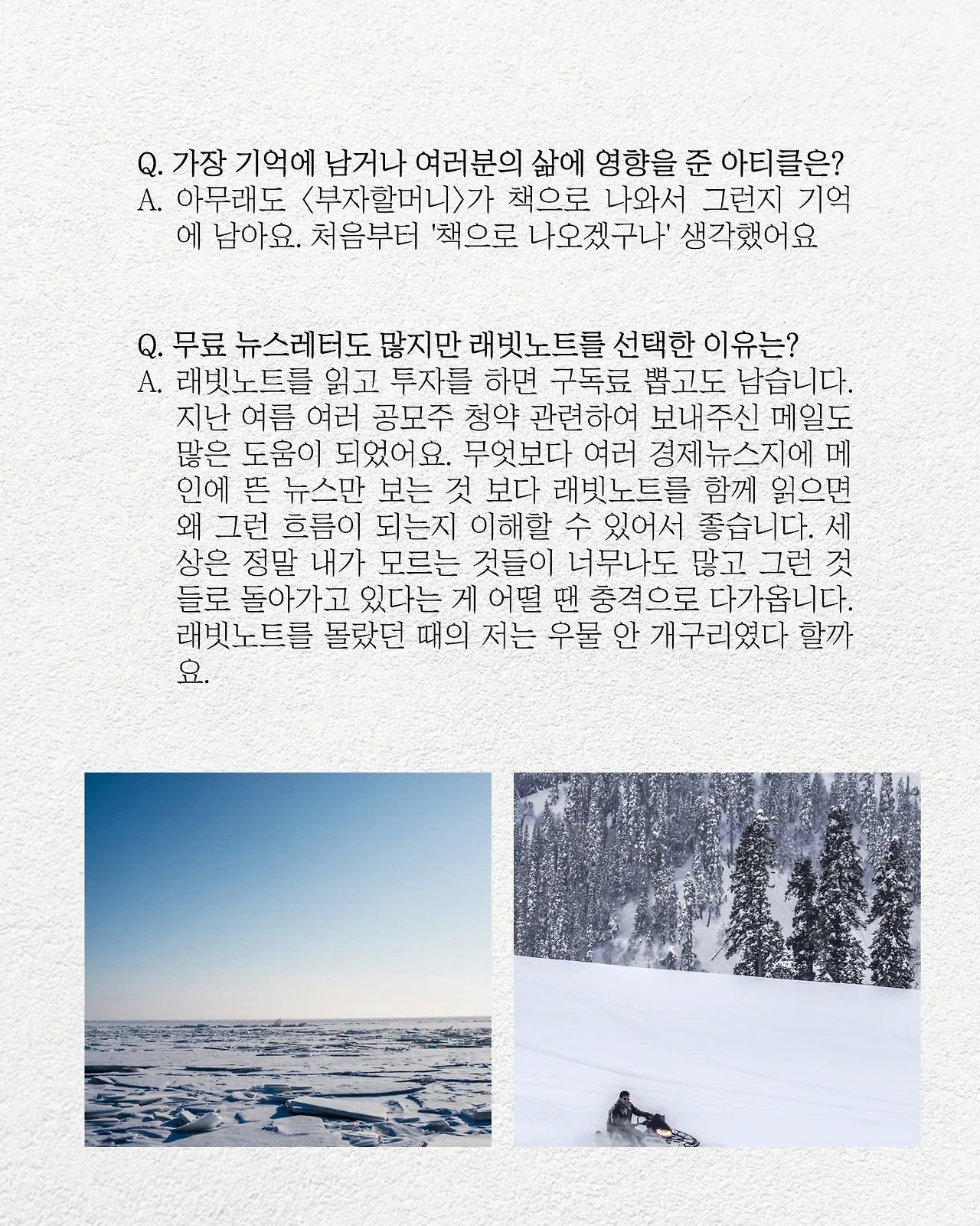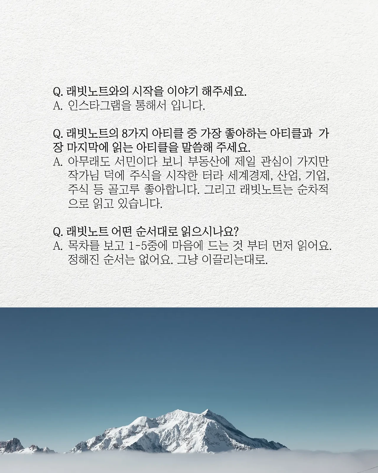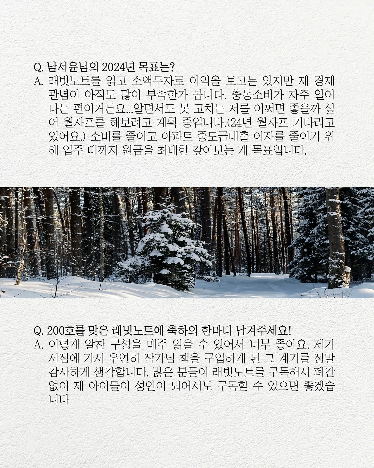 200호 스페셜 레터에 실린 구독자님 인터뷰 3편 중 하나입니다. 여러분들의 마음을 읽으니 너무 좋네요. 항상 첫눈처럼 너에게 간다~ 는 마음으로 저희는 래빗노트를 만들고 있답니다.