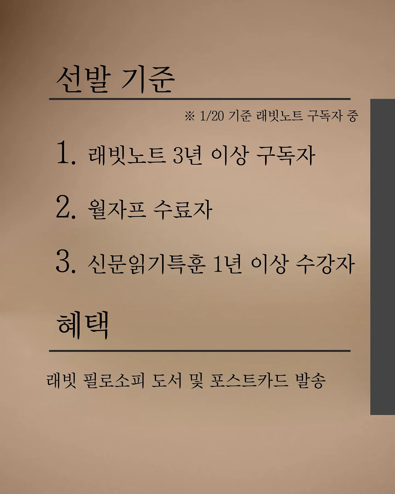 ● 래빗스쿨 3년 이상 구독/ 월자프 수료/ 신문읽기특훈 1년 이상 수강하신 분 (셋 중 하나만 해당되어도 됨. 1/20일 기준 래빗노트 구독중)