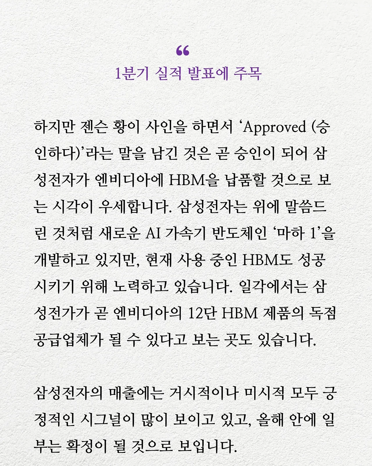 오늘 또 삼성전자가 최고가를 경신했네요. 아무리 용써도 안 되던 게 젠슨황 한 마디로 술술 풀려나가는 형국입니다.