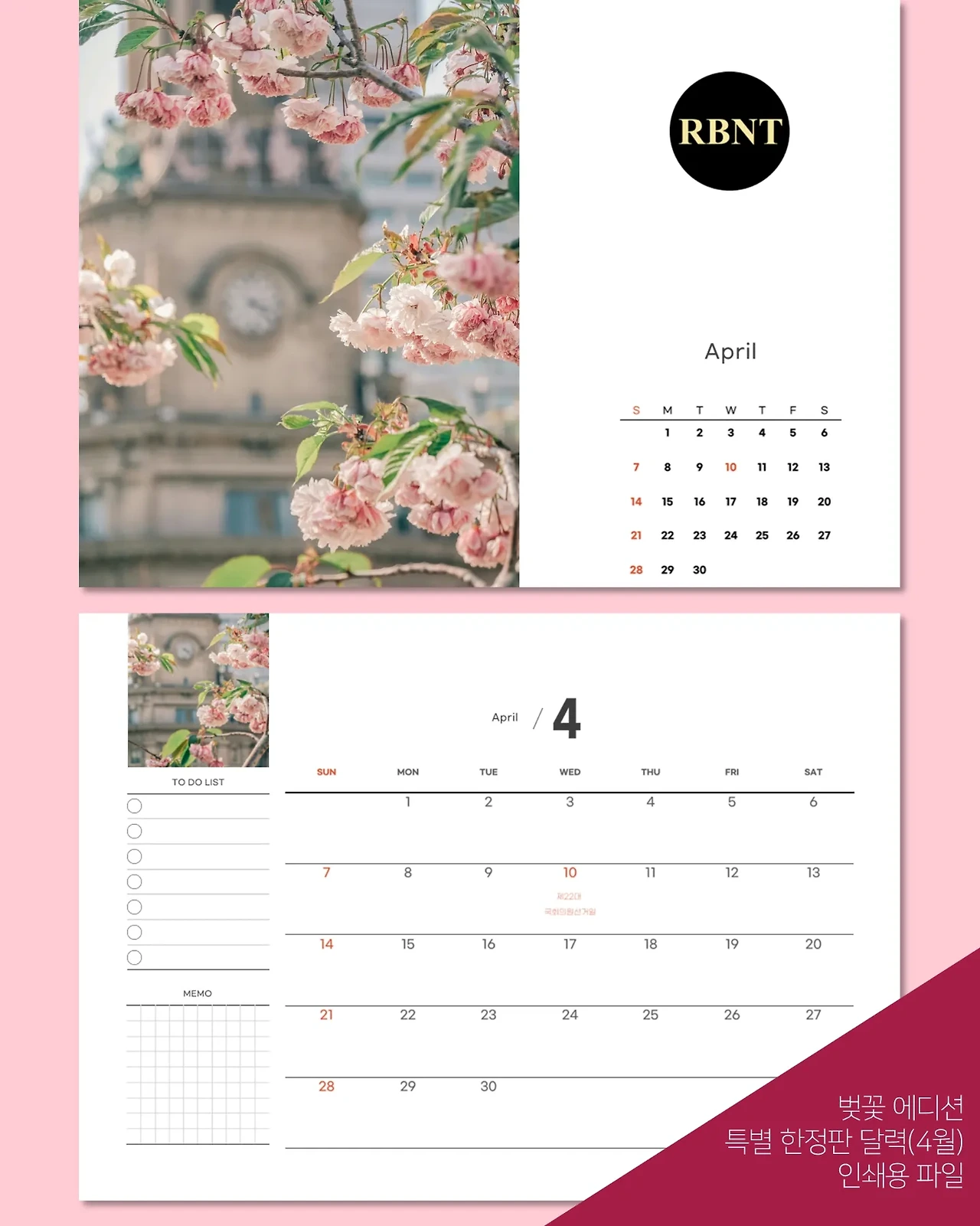 래빗노트도 4월 한 달간 벚꽃에디션으로 진행합니다. 이것만 있으면 서운하죠. 인쇄해서 냉장고나 책상 앞에 붙이실 수 있게 특별 한정판 달력(4월) 화일도 드릴게요.