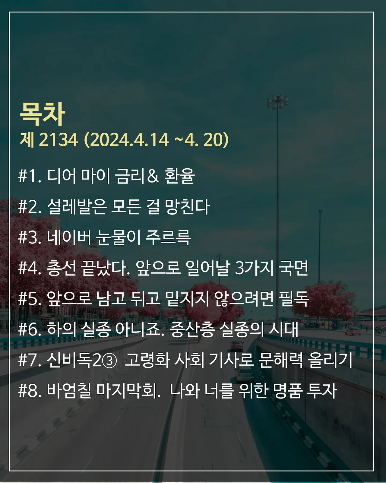 4. 이건 굉장히 중요한데요. 총선이 끝났습니다. 정치와 종교 얘기를 하지 않는 래빗노트에서 객관적인 시각으로 국먼 전환을 맞이한 우리들이 꼭 알아야 할 인사이트 3가지를 준비했습니자. 올해 하반기 투자 계획 세우는데 큰 도움 되실 거예요.