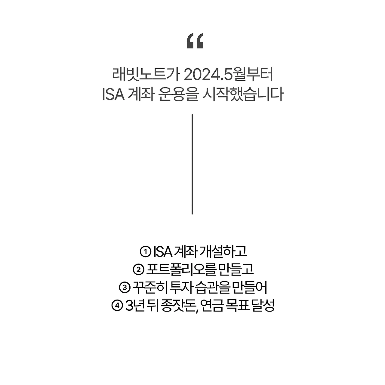경제 공부를 아무리 해도 투자 실행을 하지 않으면 말짱 도루묵이죠. 혼자 하기 힘들다고요? 어디서부터 어떻게 시작하는지 모르신다고요? 래빗노트와 만능 절세 통장 ISA계좌를 함께 운용해 봐요.