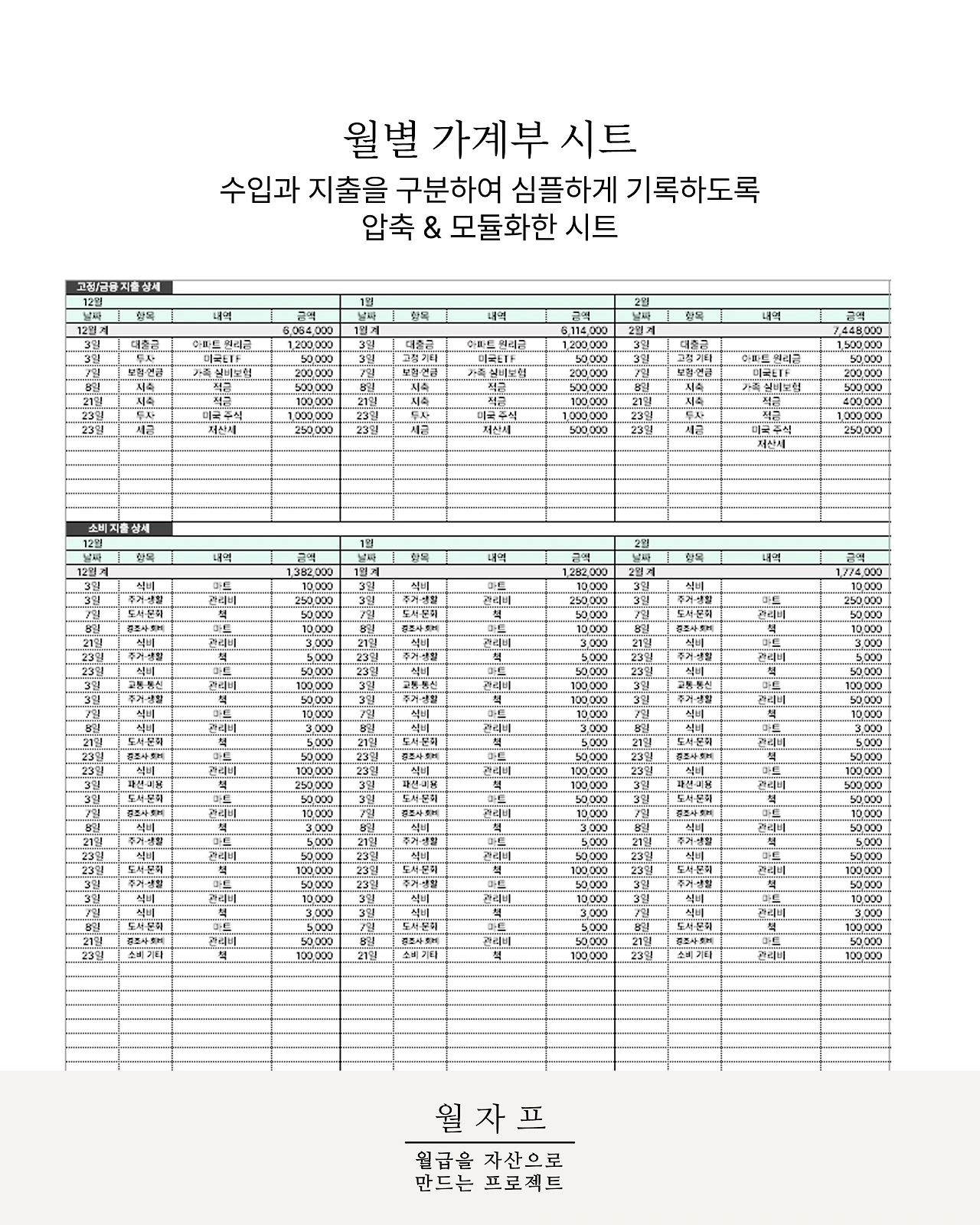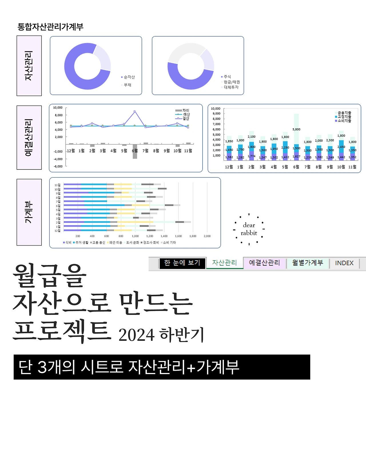 과정 중에 나오기는 하나 가계부 쓰기를 막 강조하지는 않습니다. 절약법도 워낙 인터넷에 많이 나와있고요. 월자프에서는 자산관리와 가계부를 합쳐 단순화 했습니다. 꾸준히 하려면 복잡하면 안 되니까요. 상반기보다 디자인에 힘을 실어 '디어래빗2024' 엑셀 버전으로 업그레이드했어요다
