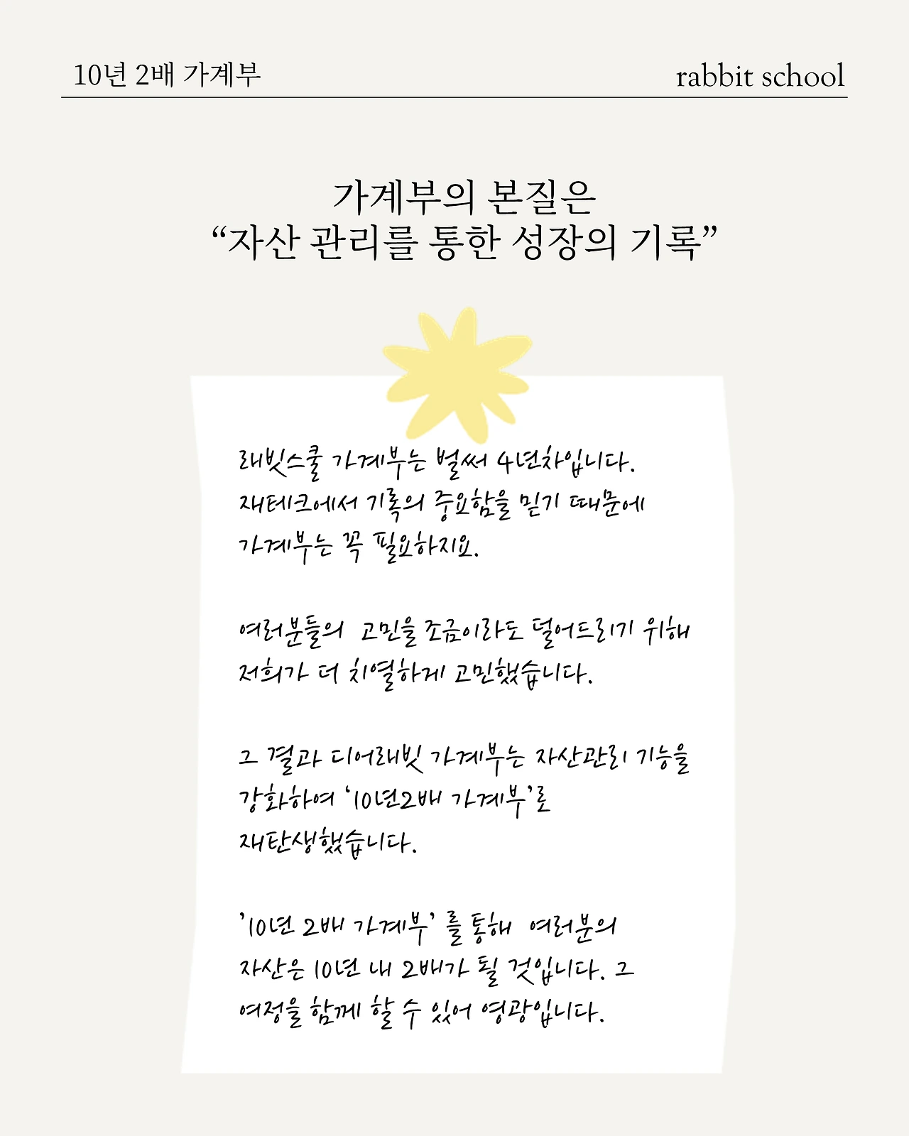 그 결과 디어래빗 가계부는 자산관리 기능을 강화하여 ‘10년2배 가계부’로 재탄생했습니다.