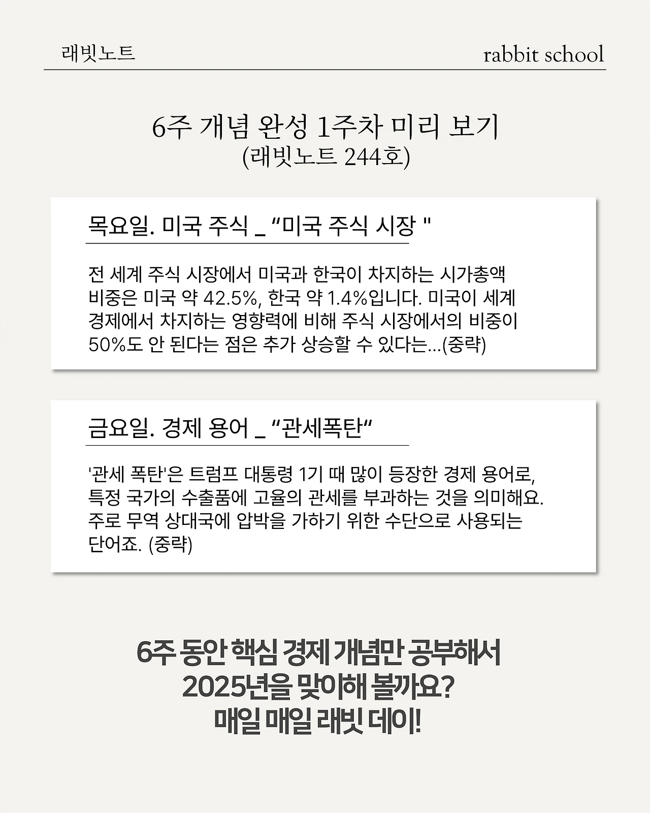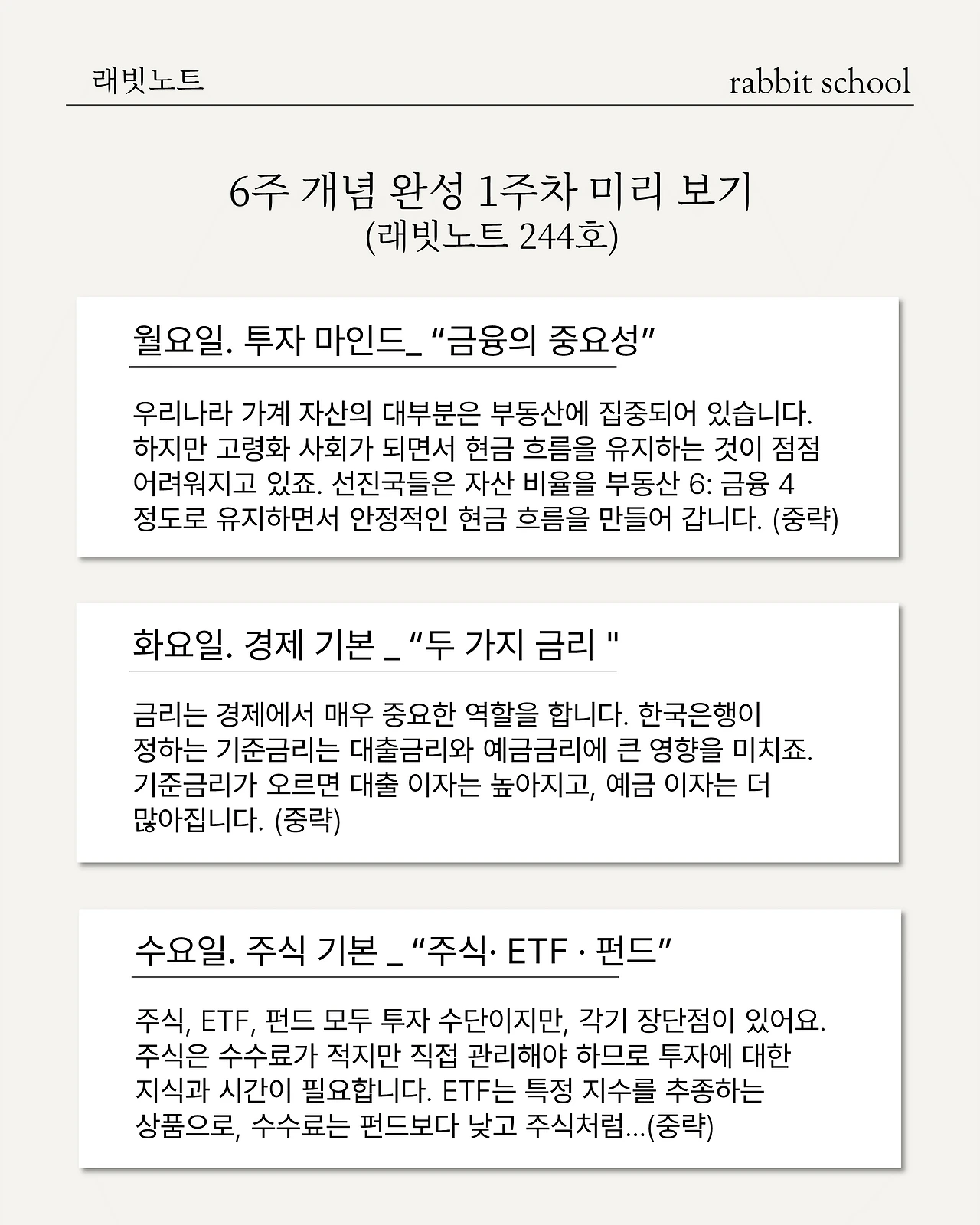 요즘 예비 고1, 예비 고2 학생들이 내년도 학습 준비를 위해 '개념 완성' 강좌를 많이 듣는다는 이야기를 들었어요. 그래서 래빗노트도 2025년 예비 투자자를 위해 '6주 개념 완성' 시리즈를 준비해 봤습니다.