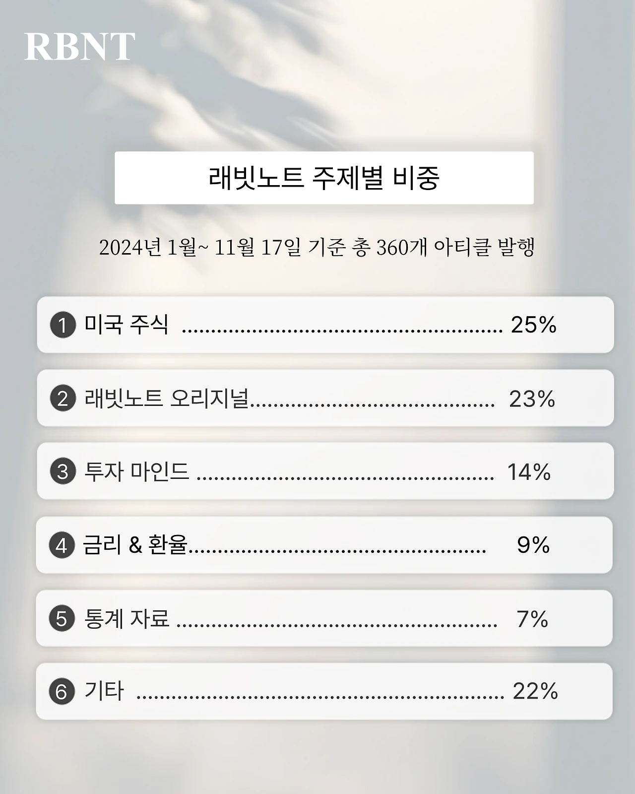 가장 많이 다뤘던 주제는 바로 '미국주식'!! 4개 아티클 중 1개는 미국 주식을 얘기했어어요. 그만큼 미국주식이 중요한 걸 래빗노트는 잘 알고 있었던 거죠.(25%)