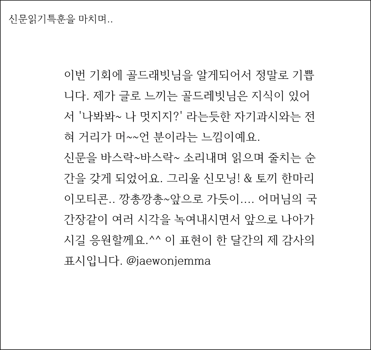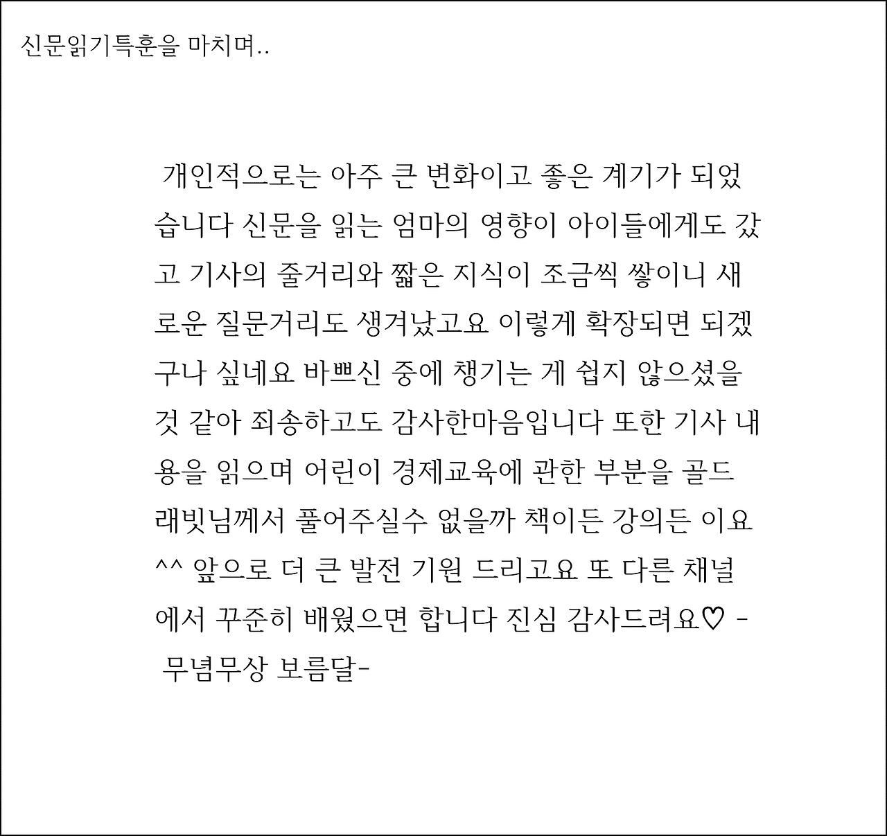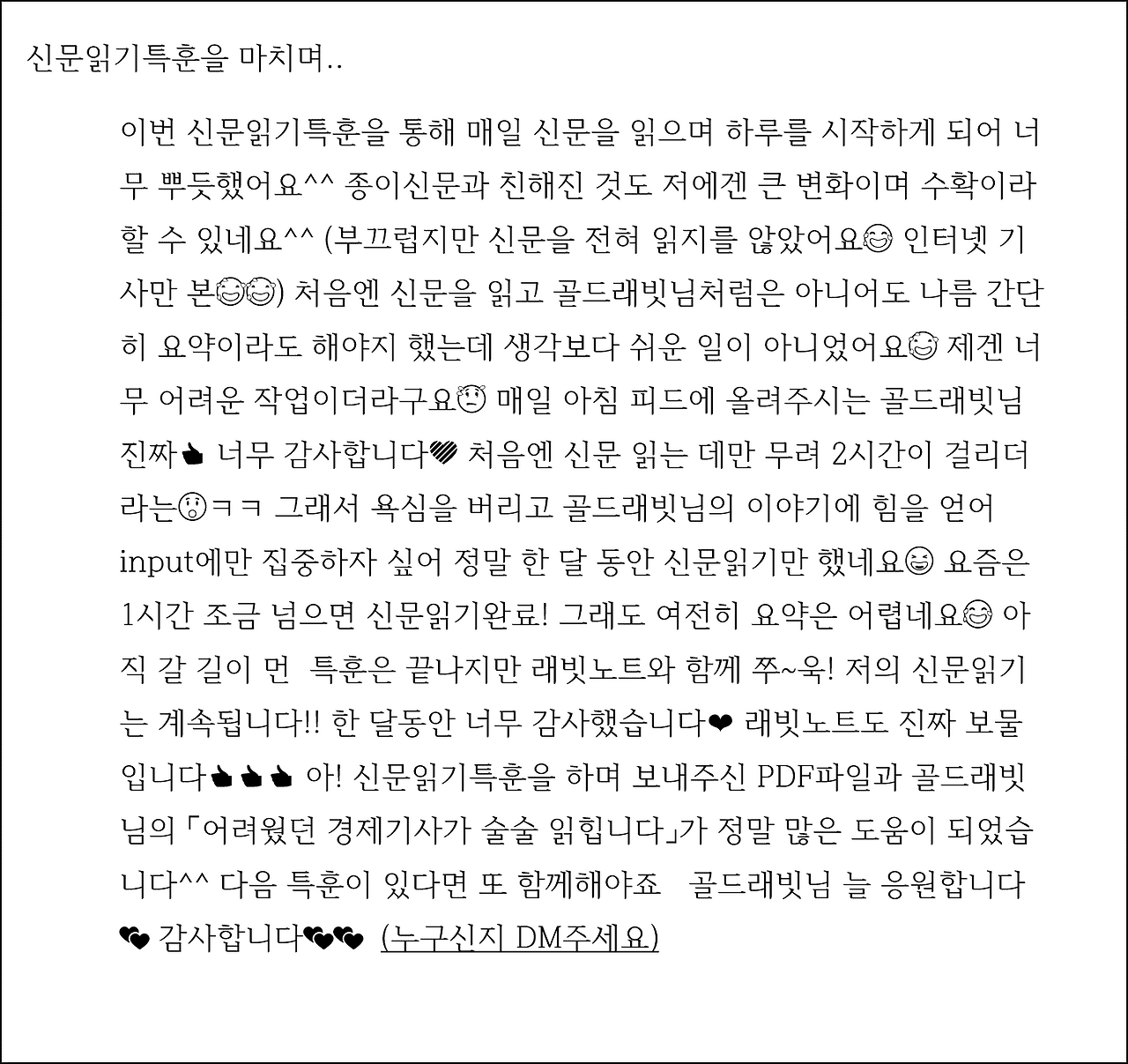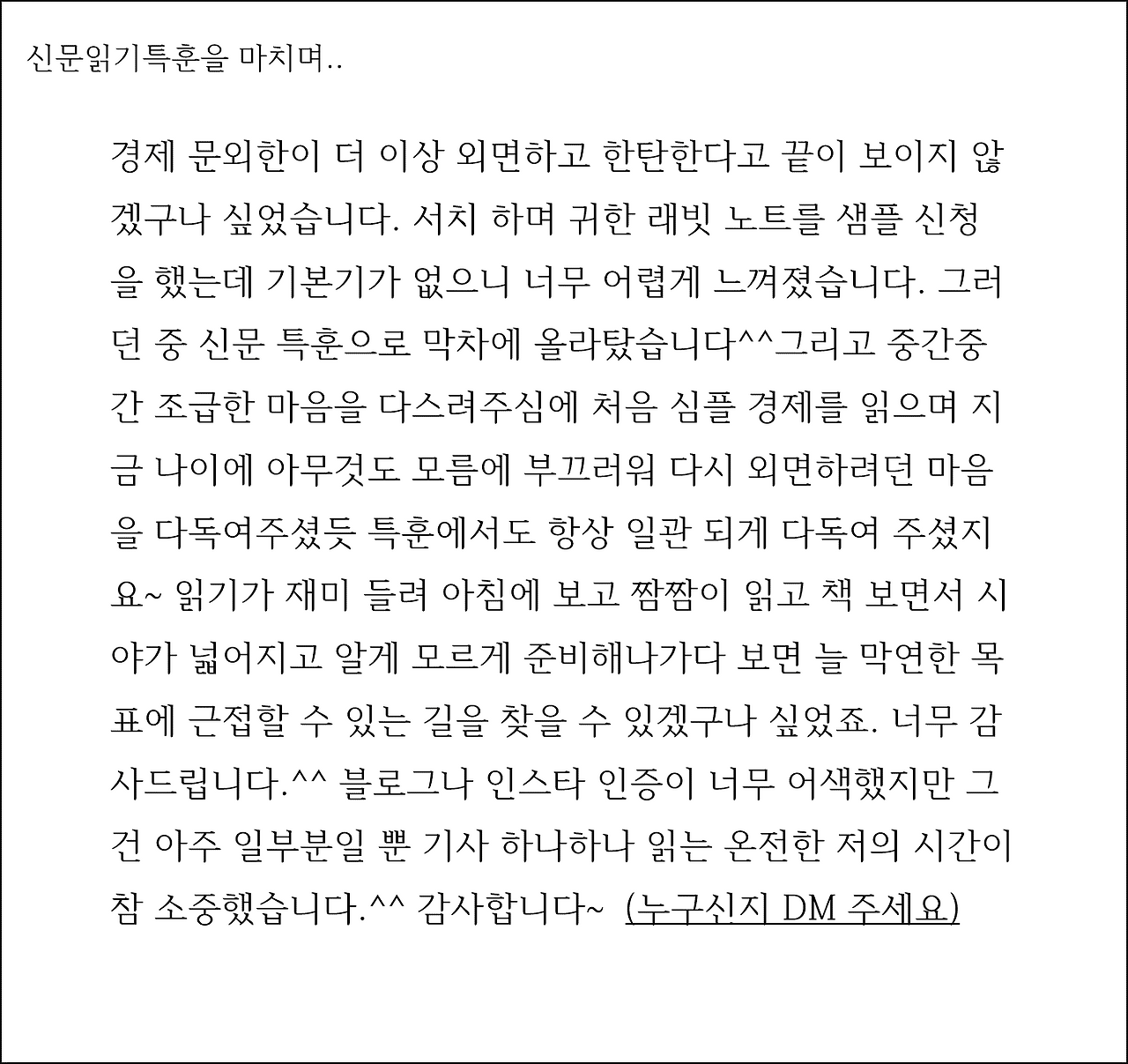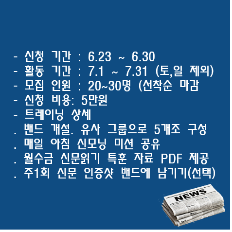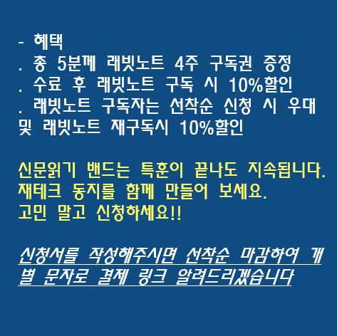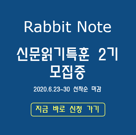 래빗노트 신문읽기 특훈( 2기) 신청서 종이신문으로 세상은 넓게 보고, 경제는 깊게 생각하실 분을 모집합니다. 혼자 시도하기 어려웠던 신문읽기. 매일 아침 신모닝과 함께 도전해보세요. 전문가 가이드에 따라 한 달간 집중 트레이