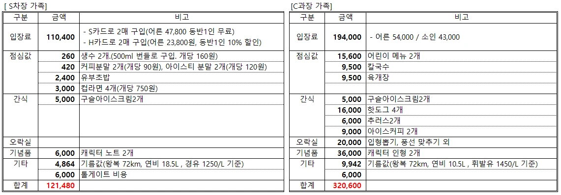 이 날 S차장 가족은 121,480원을 지출하였고 C과장 가족은 320,600원으로 S차장 가족보다 약 20만 원 더 썼다. 단지 집에 있던 몇몇을 챙겨 갔을 뿐인데, 사소한 준비로 20만 원을 절약하였다.