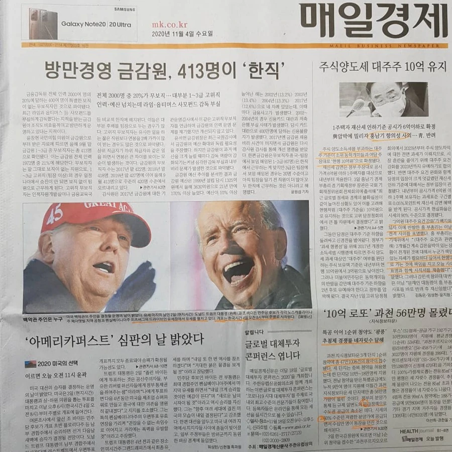 1. 간밤에 뉴욕 증시는 다우지수를 중심으로 2% 내외 상승했다. 미 대선이 3일(현지시간) 시작했고 바이든쪽으로 당선을 기대하며 불확실→확실로 바뀌고 있다는 점이 주식 시장에 긍정적인 영향을 준 것으로 보인다.이미 월가에서부터 바이든 승리로 베팅은 하고 있고, 바이든이 되면 곧장 경기부양책이 쏟아져 나올 것이라는 기대감에 다우존스 지수부터 급등했다. 다우존스지수는 27480.03(+2.0%), S&P500지수는 3369.16(+1.78%), 나스닥은 11160.57(+1.85%)로 마감했다.