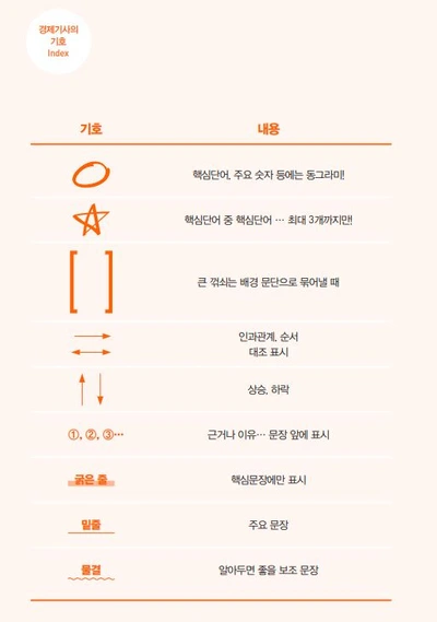 ▶ 그동안 제가 신문에 긋는 형광펜들을 유심히 보신 분들이라면 다 눈치 채셨을텐데요. 위의 사진은 제가 쓰는 기호 인덱스입니다. (굵은 줄을 핵심문장에 그으라 했는데, 저는 신문 사진을 올리니 얇은 줄로 쓰고 있습니다. 여러분들 글자 안 보이실까봐서요.)
