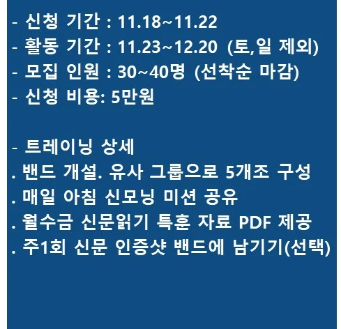 신문읽기특훈은 온라인으로 4주간 진행하는 과정으로 신문을 보다 친근하고 깊이있게 읽는 방법을 알려드립니다. 신청은 11월18일 밤 10시. 시간에 맞춰 신청 하실 수 있는 링크를 다시 공지 드릴게요. 많은 사랑과 성원 부탁드립니다!!