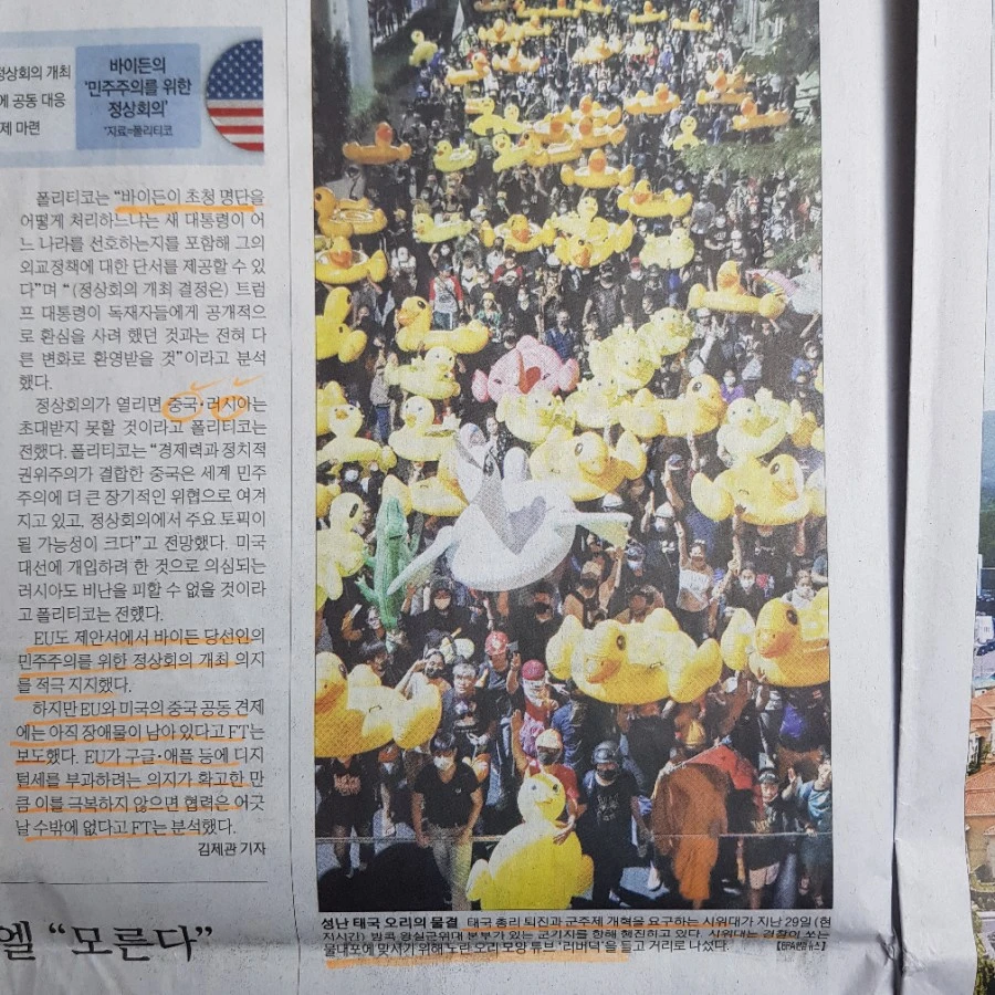 3.태국 국민들은 총리 퇴진과 왕실에 대한 반기로 러버덕을 들고 시위 중이다. 시위대는 경찰이 쏘는 물대포에 맞서기 위해서라는데. 러버덕의 노랑색은 태국 왕실의 상징적인 색깔이며 동시에 민주주의 탄압에 맞서 평화적으로 시위한다는 의미를 담고 있다. 홍콩은 우산으로 그랬고, 우리는 촛불로 그랬다.