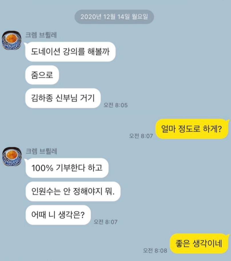 시작은 이랬습니다. 지난 일요일(12/13) 밤 누군가의 인스타 피드를 보다가 김하종신부님의 책을 봤어요. 지난 여름 기부했던 안나의집을 운영 하시는 신부님이시죠. 사회적 거리두기로 요즘 더 어려우시겠다는 생각이 들어 다음 날 아침에 친구한테 도네이션 특강 해보면 어떨까 의논 했어요.