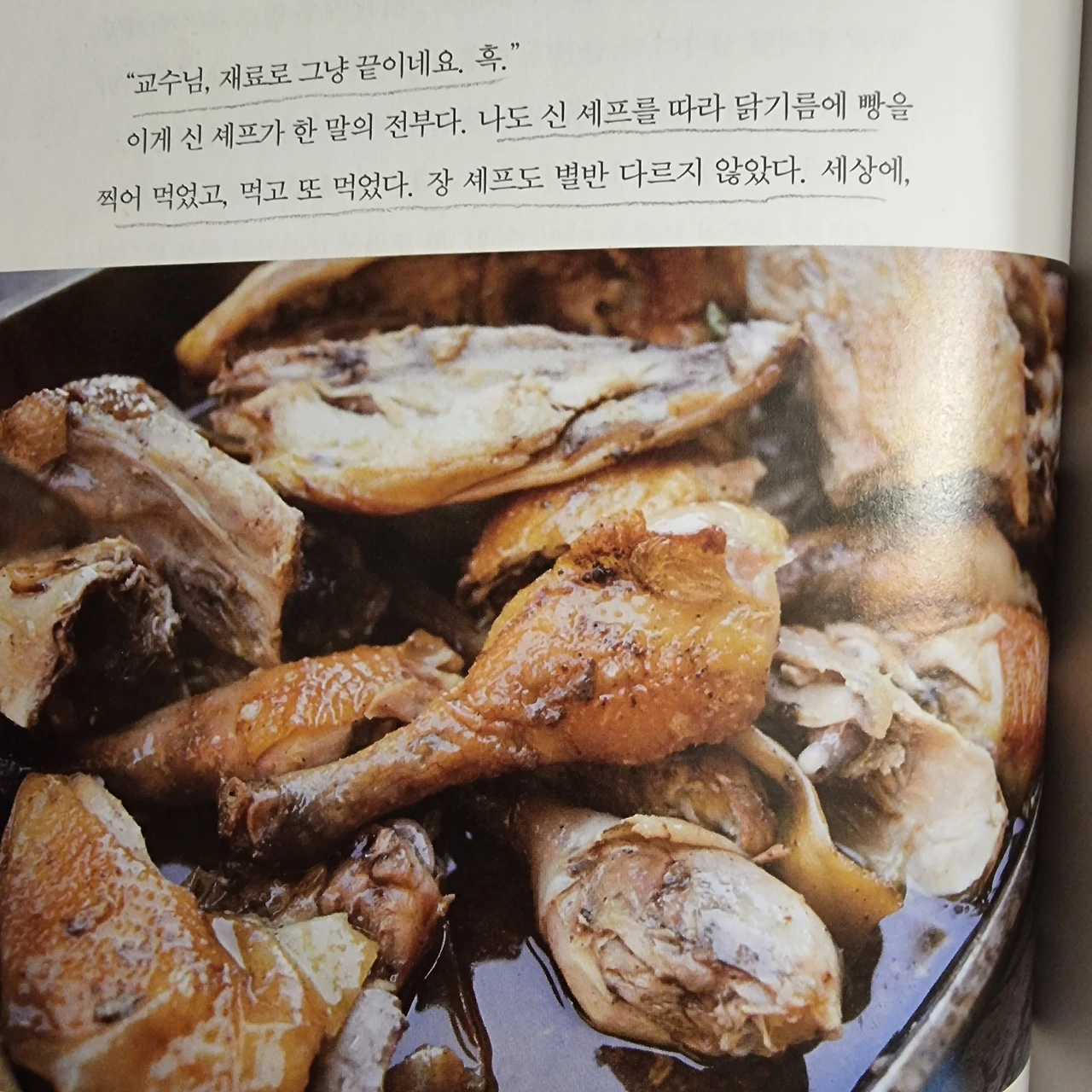 " 나도 신 셰프를 따라 닭기름에 빵을 찍어 먹었고, 먹고 또 먹었다. 장 셰프도 별반 다르지 않았다. 세상에, 한국인 세 명이 닭 요리를 먹는데 닭다리도 가슴살도 아닌, 닭기름이 제일 먼저 사라지는 기이한 일이 생겼다."