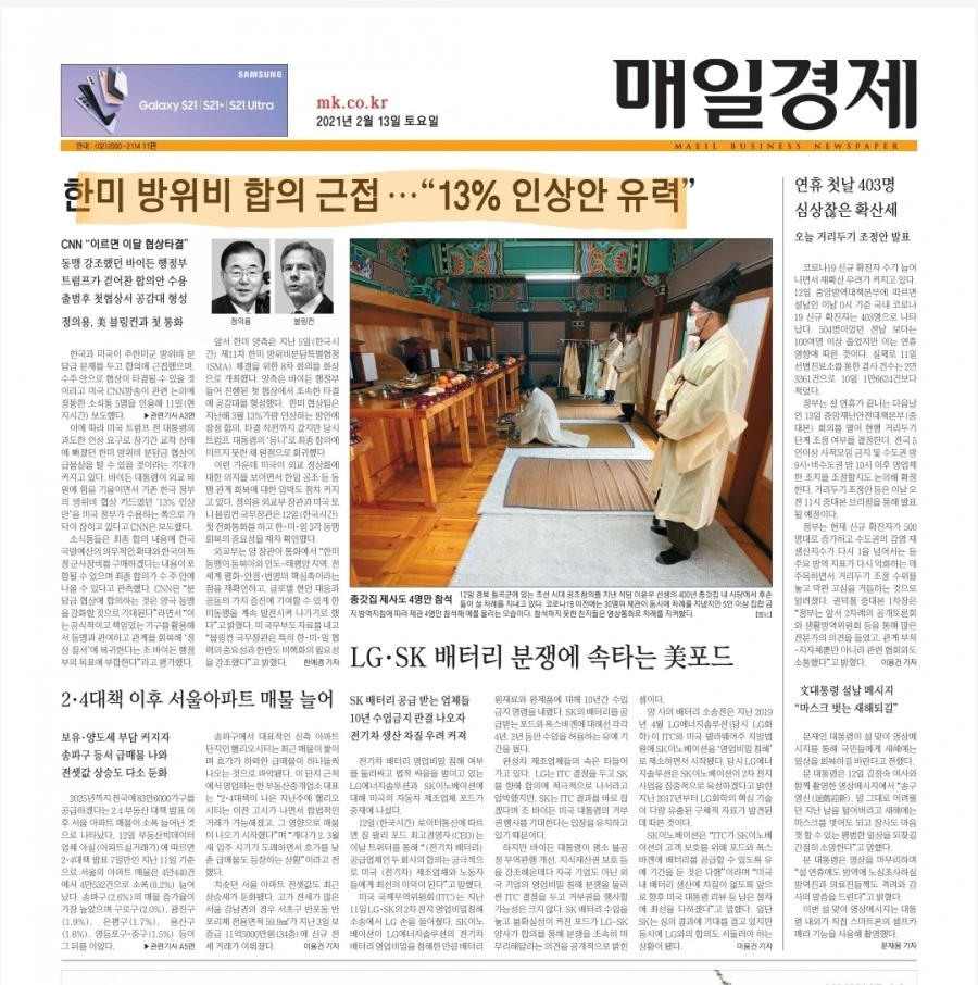 2. 주한미군 방위비 분담 비율을 13%로 수주 안에 확정될 거라고 11일(현지 시각)CNN 이 보도했다. 이에 앞선 5일 제11차 한미방위분담특별협정 체결을 위한 화상회의에서도 공감대를 이뤘다고 하고. 트럼프가 400%인상 → 50%인상 주장하며 2019년말 이후 답보상태에 빠졌던 문제가 해결 기미를 보인다. 바이든은 트럼프의 이런 동맹국과의 돈문제를 강력히 비난했던 인물이라 돈에 대해서는 관대할 것으로 예상되었다. 대신 다른 걸 요구할 거 같은데. 12일 정의용 외교장관과 토니 블링컨 미 국무장관 통화에서 한·미·일 협력을 강조한 것을 봐서 북핵문제와 미중분쟁에서 우리의 역할을 요구할 것으로 보인다. 아래 기사에서 미군 방위비가 매년 갱신이 아닌 다년계약도 유력하다 하는데 김칫국 드링킹 확률이 크다. 1년 협상이 소모적일 수 있다는 데 공감했다 하지만, 13%에 맞춰준 뒤 대중관계에 어떻게 나오나 봐서 내년에 다시 얘기할 수 있으니 믿지 말아야 한다. 돈 주는 사람과 돈 받는 사람 입장은 늘 다르다는 점을 명심해야 한다.