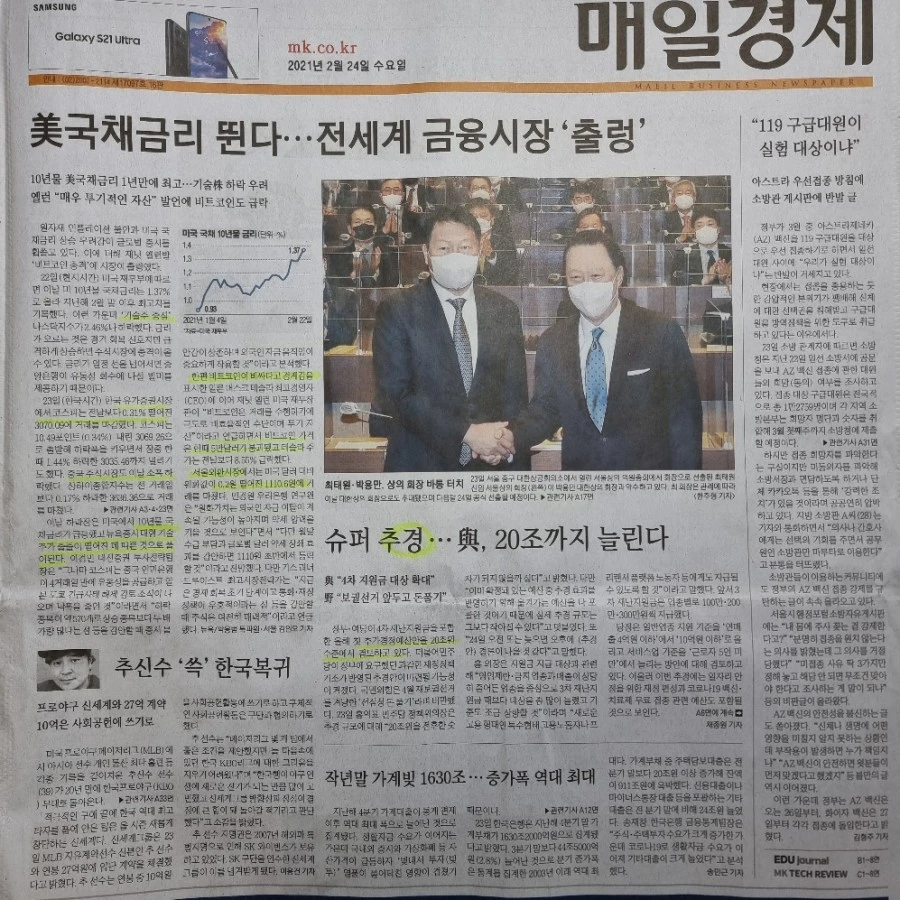 1. 미국채 10년물 금리가 1.37%로 오르면서 어제 코스피는 0.31%하락, 상하이종합지수도 0.17%하락 했다. 간밤에 연준(Fed) 파월 의장이 어떤 말을 꺼낼 지 귀추가 주목되었었는데 다행히 일관성 있게 비둘기를 날려줬다. 장 초반 급락하고 있던 증시는 파월의장의 말 한마디에 다시 회복되는 분위기였다. " 경제 회복 기대감 때문제 자연스거운 인플레이션 현상이다. 시장의 충격은 미미할 것이다"라고 얘기하며 연준이 급격하게 통화정책을 바꾸지 않을 것이라는 걸 재확인시켜줬다. 덕분에 주식시장의 하락세는 막았지만, 예전만큼 약발이 세지는 않기 때문에 급등도 없었다. 다우존스 31537.35(+0.05%), S&P500지수 3881.37(+0.13%), 나스닥 13465.20(-0.50%)로 마감.