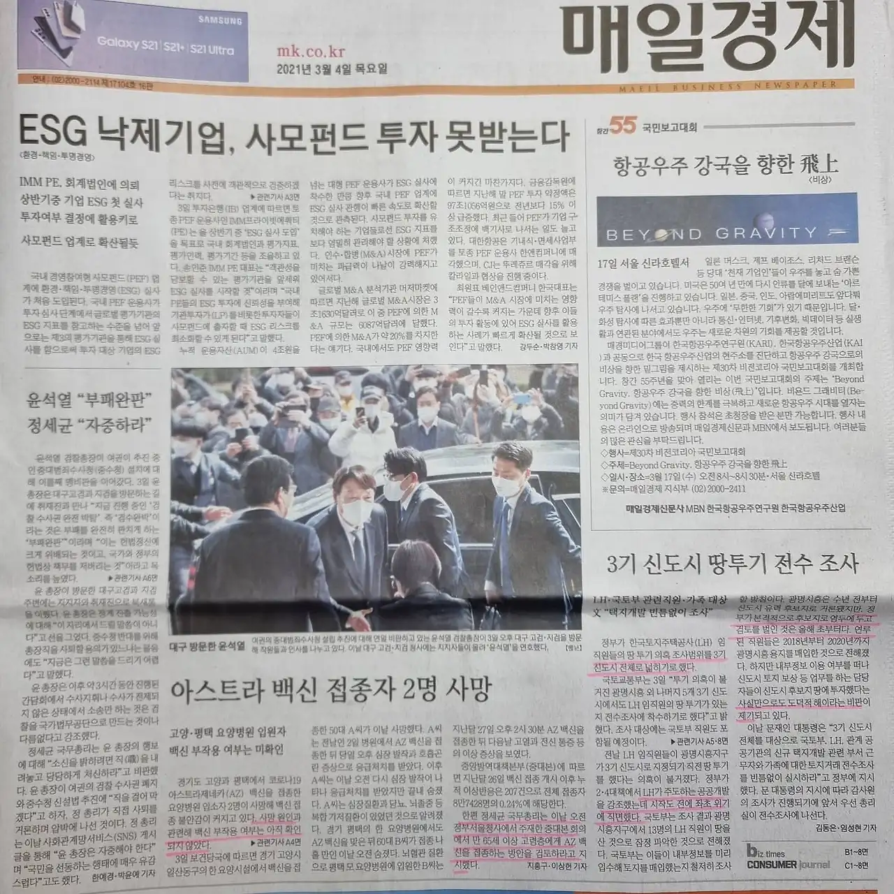 3. LH 임직원들이 내부 정보를 이용해서 땅투기에 나섰다. 그나마 2·4 대책 중 가장 실현 가능하고 대규모 공급이 가능했던 신도시가 좌초→ 분양 대기 기대 수요 감소로 → 다시 집값 상승으로 이어질 게 뻔하다. 매경이 입수한 자료에 따르면 13명은 눈물겨운 동료애로 정보도 공유하고 대출도 같이 받아 땅도 같이 샀다. 회사생활하면서 이렇게 친해질 수 있을까. LH는 사실을 확인 후 직위해제를 완료 했다한다. 보직 없는 7인은 어떤 직위해제를 받았을까. 경부고속도로 놓을 때부터 이런 부정은 있었던 걸로 안다. 그 때는 다 끌려(?)갔다고 하던데. 1·2기 신도시 때는 안 그랬을까? 2018년도 3기 신도시 도면 유출 사건도그렇게 떠들썩 했는데 계약직은 '해고'였고 정규직은 '주의'만 줬다는 게 놀라울 뿐이지. 이번 기회에 공공기관 조직도 신상필벌이 좀 명확해야 했으면 좋겠다. 세상이 불평등한 거 까지는 이해하겠지만 '공정'에 대한 희망은 어른들이 심어줘야하지 않겠나. 나조차도 이렇게 상대적 상실감이 드는데 MZ은 오죽할까. 지면 하단에 월세 상승으로 분노하는 2030에 대한 짧은 기사도 함께 나와있고, 기자24시에서는 유준호 기자님의 냉소적 분노도 느껴진다. 공공개발의 공익은 과연 누구를 위한 것이었을까?