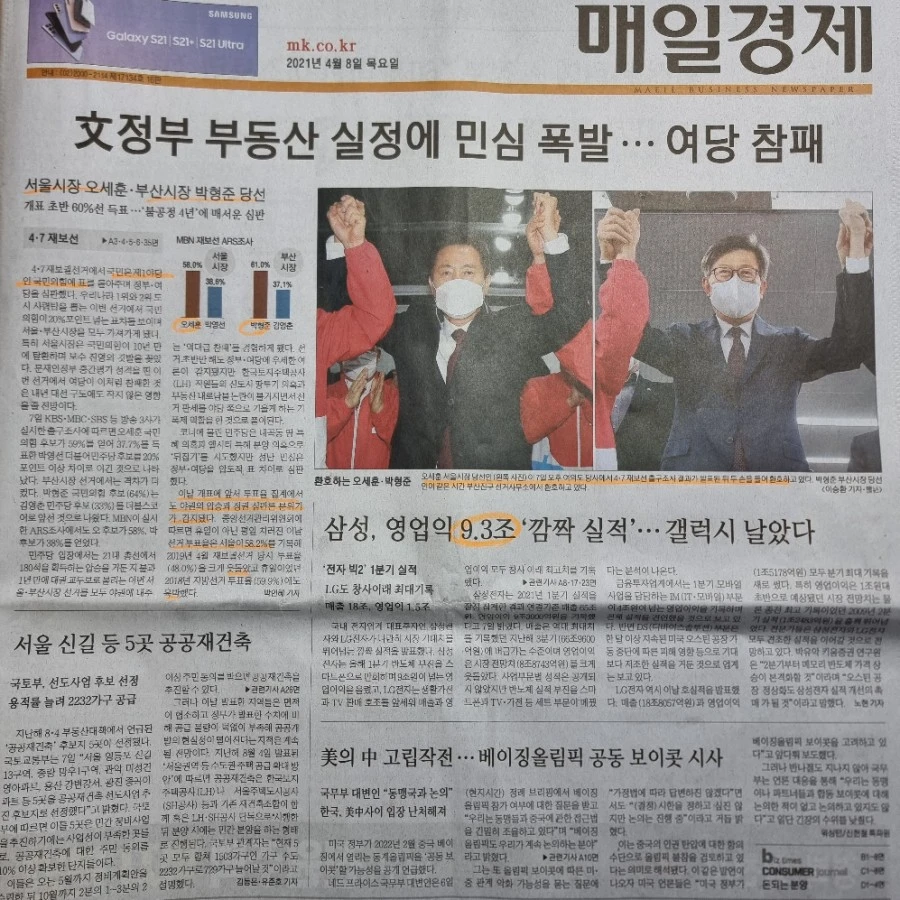 1. 재보궐선거가 여당의 참패로 끝이났다. 서울과 부산에서 각각 오세훈 후보와 박형준 후보가 당선됨으로서 국민의 힘에 정말 힘이 실렸다. 공휴일이 아니었음에도 투표율이 서울 58.2%, 부산 52.7%로 사전투표율에 이어 본 투표도 높은 투표율을 보였다. 이번 선거 후 가장 주목을 끄는 대목은 서울 부동산 정책과 내년에 있을 대선 레이스의 방향이 정해졌다는 것이다. 1)오세훈 당선인은 재건축 완화·교통· 1주택자 세금 감면을 골자로 한 부동산 정책이 핵심이었기 때문이다. 한강변 35층 이하 규제 철폐하고 재개발 재건축을 통해 주택을 공급하면서 4대권역 균형 발전을 위해 교통을 개선한다고 하니 부동산 시장은 벌써부터 들썩이는 중이다. 2) 국민의 힘으로 운이 기울었으니 대권주자들의 레이스도 빨라지겠다. 대쪽같은 윤석열 전 총장· 양보의 미덕 안철수 대표· 준비된 저격수 유승민 전 의원· 제주에서 서울까지 원희룡 지사의 행보가 기대된다. 단, 인생도 끝날 때까지 끝난 게 아니라는 말이 있다. 지금 선거 이겼다고 희희락락 하다가는 또 판세는 뒤집힐 수 있다. 더불어 민주당이 선거는 패했지만 지도부 싹 사퇴하고 심기일전의 모습으로 제대로 공정을 보여준다면 대선은 다른 스토리가 펼쳐질 수 있다는 것.