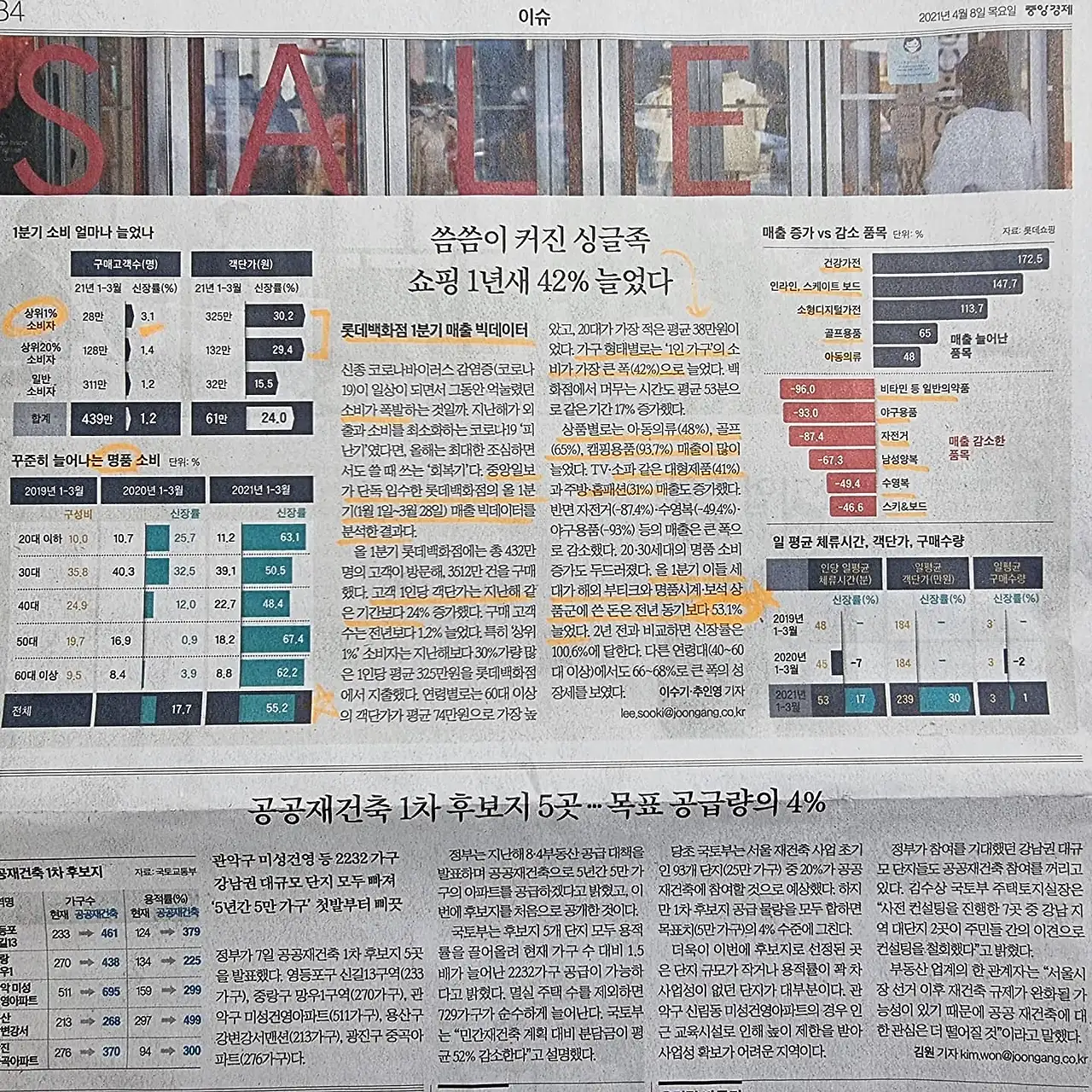 5. (중앙일보) 단독 입수한 롯데백화점 1분기 매출 분석. 제목은 싱글족이 엄청 소비 많이 한 것처럼 써놨는데 정작 내용은 한 줄이고 그래프도 없다. 뭐지? 핵심만 몇 개 본다면 1) 상위 20%소비자의 객단가가 약 30%늘었다. 2) 명품 소비는 전 연령 평균 55.2% 증가. 3040 빼고 전 세대가 60%이상 증가세로 나타나 폭발적 보복 소비는 이런 거구나를 보여준다. 3) 매출 증가 품목은 올해는 학교 가야지 아동복 · 띄엄띄엄 운동하자는 골프복· 도심에서 떠나자는 캠핑용품· 집콕하니 가전제품&소형 디지털 가전 4)매출 감소 품목은 수영· 스키· 자전거· 야구 등등 운동복, 재택근무에 결혼도 안 하고 면접도 못 보니까 남성양복· 작년에 다 사먹어서 올해는 안 사도 되는 비타민 등이었다.