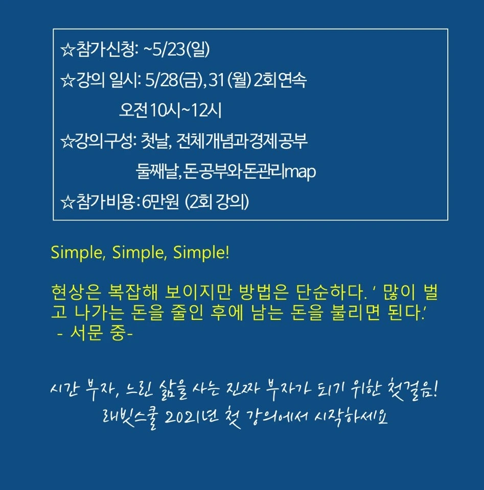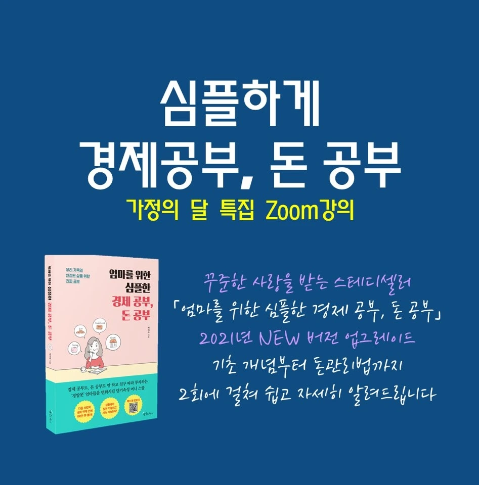 래빗스쿨 2021년 첫 강의 !! ⠀ 가정의 달을 맞이하여 엄마들을 대상으로 한 경제 교육 강의를 해달라는 많은 분들의 요청으로 래빗스쿨서 강의를 준비했습니다. ⠀ 주제는 “심플하게 경제공부 돈 공부” ⠀ 엄마들을 위한 경제 공부에 대한 이야기에서부터 스테디셀러 “엄마를 위한 심플한 경제공부, 돈공부”를 보다 업그레드이한 내용도 알려드립니다. 뿐만 아니라 작가님에게 엄마들에게 해드리고 싶었던 이야기들까지 이번 강연에 담을 예정입니다. 강의 신청은 아래 링크에서 가능합니다.