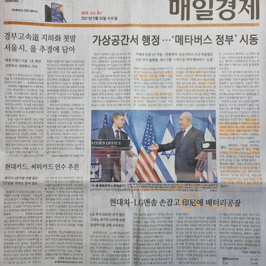 4.(매경+중앙) 인도네시아 관련 기사 3개를 함께 보자. 먼저 매경 A17 기업면에서 현대차와 LG에너지솔루션이 2년여 고민 끝에 인도네시아에 전기차 배터리 공장을 설립한다고 전했다. 왜 하필 인도네시아인가? 인도네시아가 전기차 시장으로 새롭게 부상하는 동남아를 선점하기 위한 전략 지점이기 때문이다. 1)현대차는 인니를 생산기지+ 싱가포르 글로벌 혁신센터로 묶어서 시너지를 높일 계획이고, 2) LG엔솔은 인니가 가진 배터리 핵심 소재인 니켈·코발트· 망간 등 활용 + 인니 정부의 강력한 전기차 육성의지에 점수를 줬다. 인니 정부가 얼마나 적극적인지는 중앙일보 B3에서 확인 가능하다. 두 회사의 합작법인(JV) 최종 성사를 위해 24일 루훗 해양·투자조정부 장관을 한국으로 보냈다. 다시 매경 A13 금융면으로 돌아와 보자. 루훗 장관을 만나기 위해 국내 금융사 수장들(KB,우리, 신한, NH,DGB,하나)이 이분 숙소인 호텔로 찾아왔다고 한다. 인니는 전기차 배터리 뿐만 아니라 금융사들이 공을 들이는 신남방 핵심기지 중 한 곳이기 때문이다. 코로나로 해외 출장이 여의치 않지만 고위급은 얼굴을 맞대고 풀어야 하는 문제들이 있어 이번 기회에 사이다 같은 회의를 했다고 한다. 내용이 길지만 한줄로 요약하면, LG엔솔과 현대차가 전기차배터리 생산기기를 인도네시아에 짓고 우리 금융사도 진출을 확대할 계획이라 한다.
