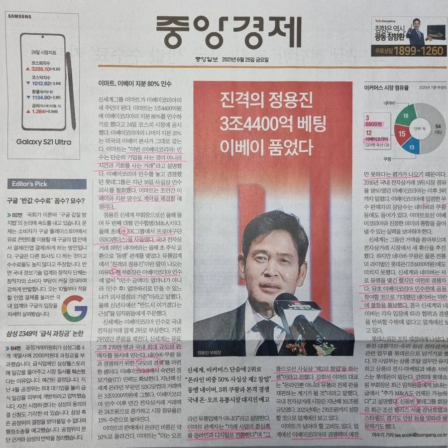 3.(중앙일보) 진격의 정용진이라는 별명답게 신세계이마트는 이베이코리아의 새주인이 된다. 인수 과정에서 주요 후보군들이 중도 포기하고 동맹 네이버도 떨어져나가 이마트 단독으로 3조 4400억원에 이베이코리아 지분 80%를 인수하기로 했다. 정용진이 원했던 건 온라인 세 확대를 통한 온오프 '규모의 경제'였지만 돈을 쏟아 부어도 쉽지 않았다. 인수합병 자체가 그 회사의 시간과 기회를 사는 것이기 때문에 이마트는 단숨에 점유율 2위(15%)로 올라설 수 있겠다. 하지만 옥션·지땡땡·지구 예전만 못하고, 오픈마켓 판매자 네이버와 쿠팡으로 이동했고, 이마트도 좋은 상황은 아니기 때문에 이번 결정이 잘한 것인지 아닌 것인지는 시간이 지나봐야 알겠다.