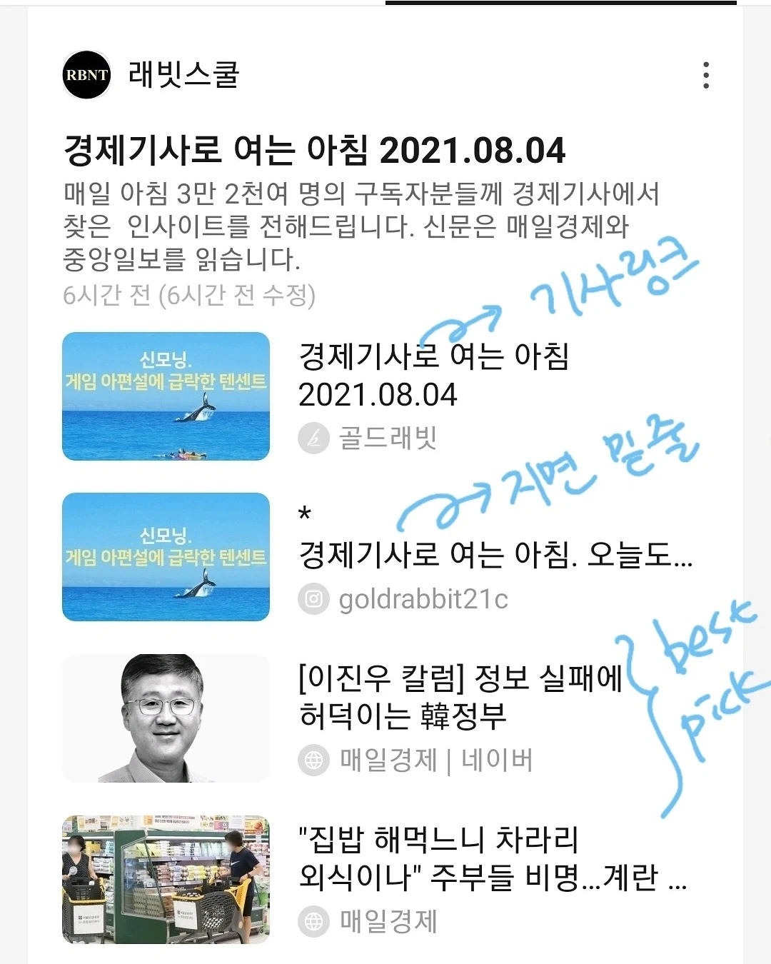 카카오뷰 래빗스쿨 채널 <경제기사로 여는 아침>에 2가지 버전을 올립니다. 브런치는 기사 전문을 보실 수 있게 해당 언론사 기사 링크가 연결 돼있고, 인스타는 지면 위에 제가 형광펜으로 밑줄 그은 걸 보실 수 있어요. 그리고 오늘 베스트 픽 기사 2~3개를 본문과 상관없이 추천드려요. 가서 채널 추가 부탁드린다는 말을 길게 썼네요.