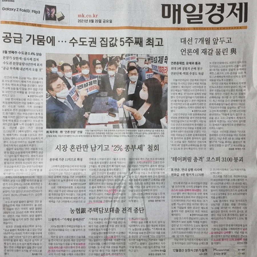 2. 고승범 금융위원장 후보가 강력한 가계대출 통제를 시사한 가운데 NH농협이 선제적으로 주담보· 전세대출 전면 중단에 나섰다. 24일부터 11월 말까지 석달간 신규 주택담보대출과 전세대출, 아파트 집단 대출 등을 중단한다고 19일 밝혔다. 이 기간에 기존 대출의 증액과 대환대출도 불가능하다고 한다. 이렇게까지 하는 이유는 여지껏 당국의 가이드라인을 준수했지만 연간 5%인 가계대출 증가율 목표치를 이미 상반기에 넘어섰기 때문에 신규 대출을 중단하겠다 선언한 것이다. 문제는 이 풍선효과가 다른 은행들로 튈 거라서 대출중단이 곳곳에서 나타날 수 있다는 것이다. 아직 거리두기가 연장될 지 모르는 상황으로 경기 회복이 더딘데, 주택을 담보로 대출 받아 생할비로 쓰거나 장사하시는 분들을 구별해 내기가 쉽지 않을 것 같다. 한국은행은 기준금리를 곧 올릴테고. 코스피는 3100 아래로 떨어졌으니. 의도하지 않게 주식을 매도 해야 하거나 당하실 분들도 생기겠다.