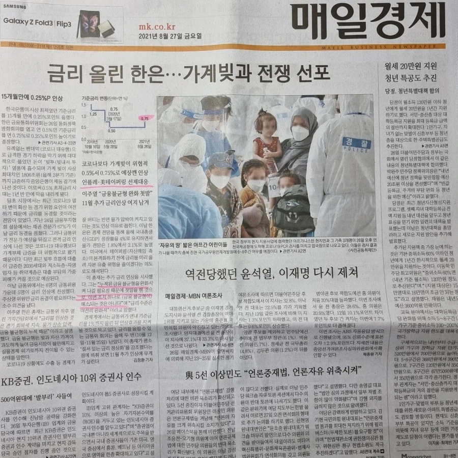 1. (중앙일보) 한은 금통위는 26일 기준금리를 연 0.5% → 0.75%로 올렸다. 코로나19 팬데믹으로 지난 해 3월 전력 1.25%→ 0.75%로, 5월 다시 → 0.5% 로 떨어뜨린 뒤 1년 3개월 만이다. 한은은 금리 정상화라고 말하라지만 저는 '인상, 인상, 기준금리 인상'이라고 말하련다. 속이 좀 씨원하군. 기준금리는 물가와 환율 등을 고려하여 정하는데, 이번에는 콕 찍어 금리 인상 배경으로 '가계대출 증가세'와 ' 주택가격 오름세'라고 밝혔다. 물론 인플레이션과 미금리 인상 선제적 대응은 기본이다. 예고된 악재였기 때문일까. 금융 시장의 변동폭은 크지 않았다. 코스피는 전날 대비 0.58%하락, 3년만기 국고채 금리는 전날 대비 0.037%포인트 하락, 원화 가치는 전 거래일보다 2.4원 하락하며 거래를 마쳤다. 변동폭은 크지 않았으나 보편적인 경제이론과는 거꾸로였다. 기준금리를 올리면 원래 원화값↑ , 채권금리 ↑이어야 했다. 이주열 총재 말씀처럼" 이제 첫발을 뗐다 = 금리가 지속적으로 오를 것이다" 라는 예상 때문이라는 분석이다. 지면 헤드라인처럼 '시작됐다, 이자 낼 걱정'