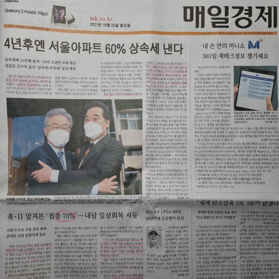 1. 지난 23일 오후 2시, 백신접종률이 70%를 넘어섰다. 선진국보다 접종 시작은 늦었으나 접종률 70%달성 시기는 영국· 일본보다 빨랐다. 시작은 미약했으나 그 끝이 창대해야 할텐데.. 정부가 '위드 코로나'로 방역 체계 전환 목표로 삼았던 수치에 도달하면서 본격적으로 위드코로나 상황으로 전면 전환한다. 오늘(25)일 초안 발표, 29일 최종안 발표 예정.
