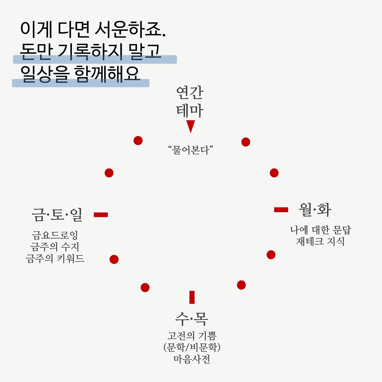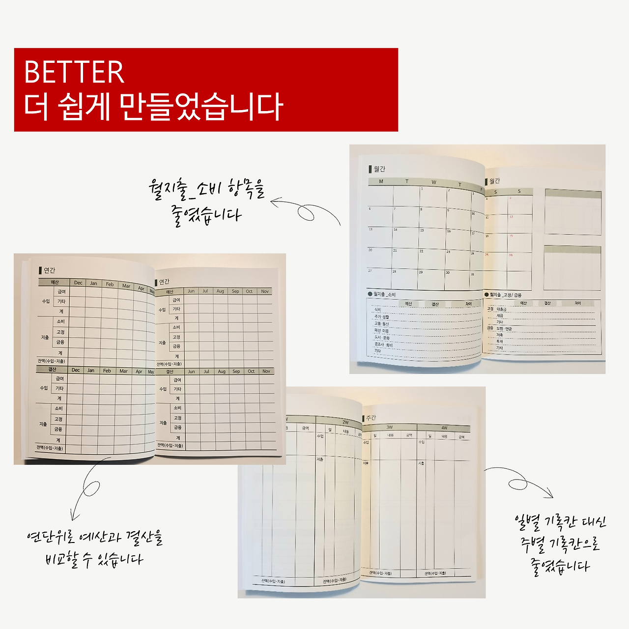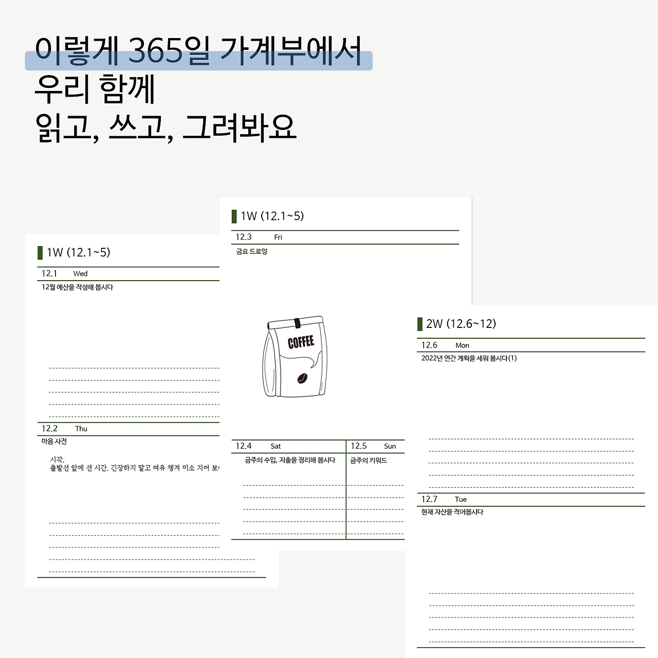 가계부에 오늘 돈을 얼마 썼냐부터만 적으셨나요?여러분의 일상도, 여러분의 생각도 적어보세요.단순히 돈의 출납만 기계적으로 적을 때보단 훨씬 더 재미있게 가계부를 작성할 수 있으실 거에요.골드래빗 작가님이 직접 고르고 고른 고전 문장부터 재테크 상식까지 쓰는 즐거움, 읽는 즐거움, 배우는 즐거움, 생각하는 즐거움을 드리는 디어래빗이 될거에요.