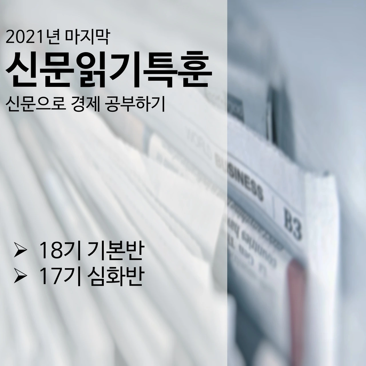 모집기간은 11.20~11.28일까지이며, <기본반은 11.29-12.26 4주과정>, <심화반은 11.29~12.19 3주 과정> 으로 진행됩니다. 2021년 마지막 한달은 신문읽기특훈과 함께 해요!! 신문읽기특훈에 여러분들의 많은 성원과 관심 부탁드립니다.
