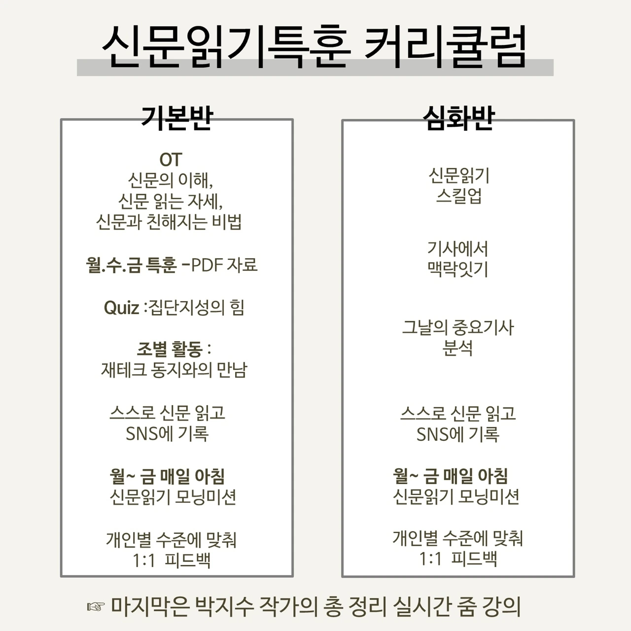 기본반은 누구나 신청하실 수 있으며, 심화반은 기존 신문읽기특훈 기본반 수료자만 신청 가능합니다.
